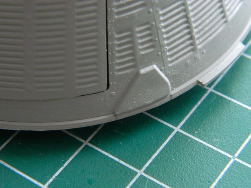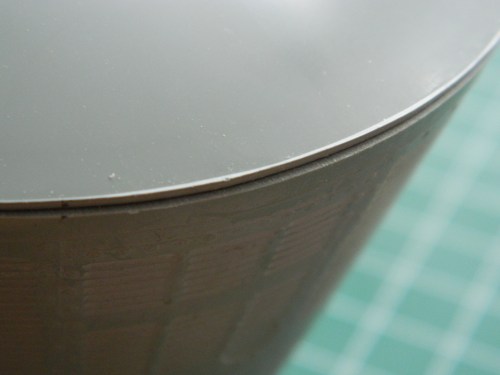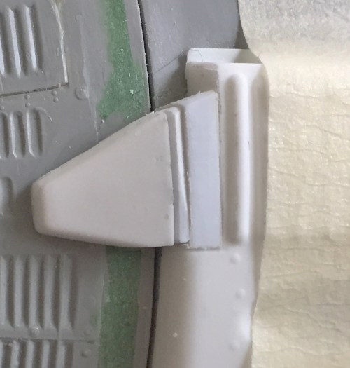 Initially it seems like an easy fix. Just file down what extends past the edge of the capsule and add plastic to where the heat shield doesn’t quite meet the edge of the capsule. The problem with that is that this heat shield also has to fit the top of the retro module and if I did that, it wouldn’t fit at all. I had to make the edge of the capsule conform to the shape and edge location of the heat shield. Putty time: