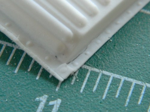 To put the shingles back, I had to make them. A strip of .005″ (.127mm) plastic with more .005″ (.127mm) plastic cut to the dimensions of the existing (and unmolested) shingles had to be made: