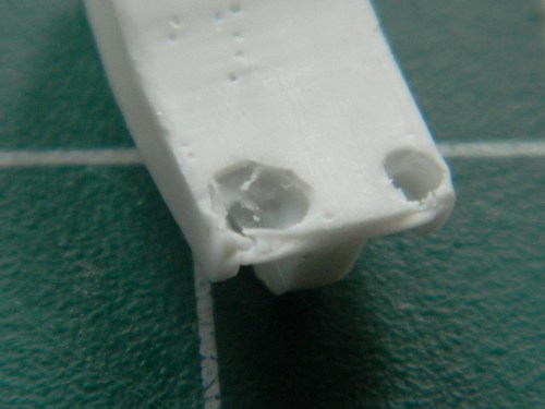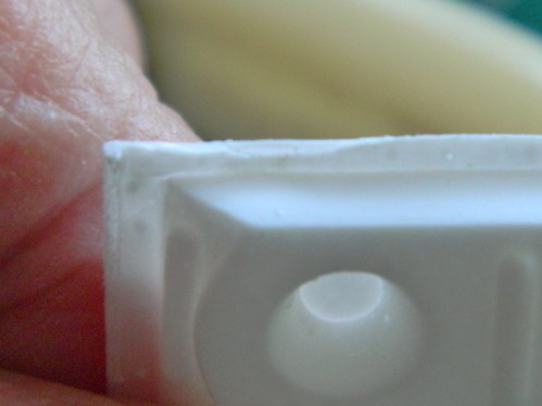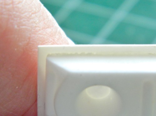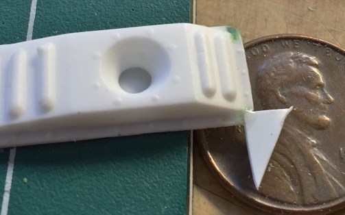 All the problems I’m having with the kit parts were engineered into it, guaranteeing problems. I don’t think that was Revell’s intention, but that’s how it is. In my kinder moments (rare that they are), I suspect the person(s) who cut the dies for this kit wasn’t a master die cutter. I don’t think they were journeymen. I suspect they were new-hire apprentices. And what makes me think that? In the next photo, that U-shaped area is a positive; it sticks up from the surface. That means that when the dies were being cut, the die cutter tool (I mean the tool…I’m hoping the person holding the tool wasn’t also a tool…) skipped across the surface of the die and left a groove behind. And I mean left a groove behind! What sort of quality control lets something like that out of the die cutter shop and into the production area? Nothing I can say would be a “kinder moment”: