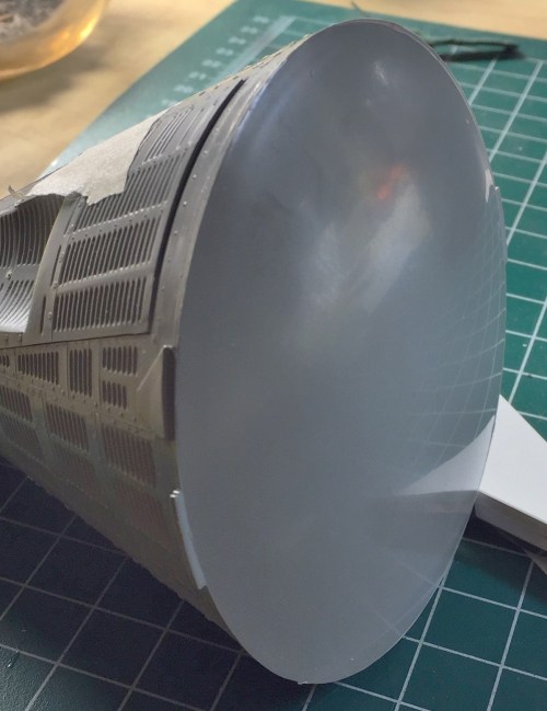 The edge of this OMS unit was poorly cast and had a very pronounced bubble along its edge. To fix that I cut away the mounting flange and replaced it with a sheet of .010″ (.254mm) styrene: