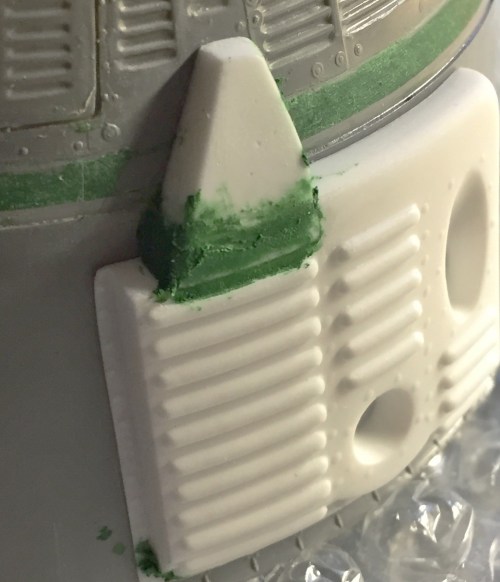 On the other side of this OMS pack, close examination of the flaw at the edge in the picture below was molded that way. That meant the damage to the master was already done before the mold was made. Gosh…what a surprise it showed up in the casting:
