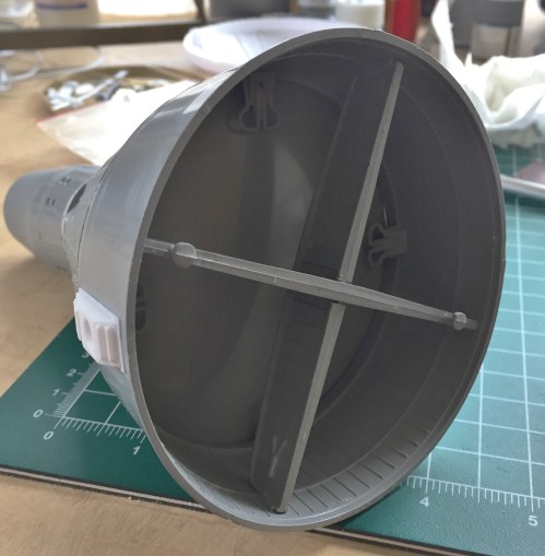 Before I could add the resin AM parts, the retro module had to be glued to the capsule. The kit provides rudimentary details for the inside of both retro and service modules. Because I can’t find any reference photos of exactly how things were mounted, wired, and plumbed, I’m not adding those details. The only exception were the braces for the retrorockets. Initially it was because there are a couple of locating pegs to mount the service module. As I’ve been working on this and considering exactly how I was going to hold this thing while I painted it, I realized those engine braces would do quite nicely as a painting handle: