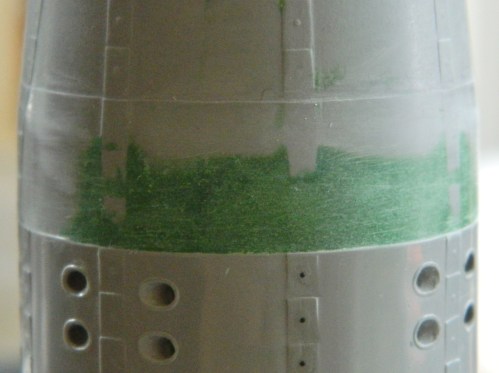 And one last thing (for now…I’m sure there will be others) that I really did not want to do. The fit of the nose cone to the OMS ring was as high as all the other fittings were not. I didn’t want to deal with the shingles that would be destroyed in fixing this fit. Yet I’ve gone to such lengths for other things, and people will probably look closely at that (quoth my Ego), so I don’t want them to wonder why I went to such lengths in other places and overlooked an obvious fit problem. Well, excrement…let’s just fix the sodding thing. I added putty and worked it until the fit was correct: