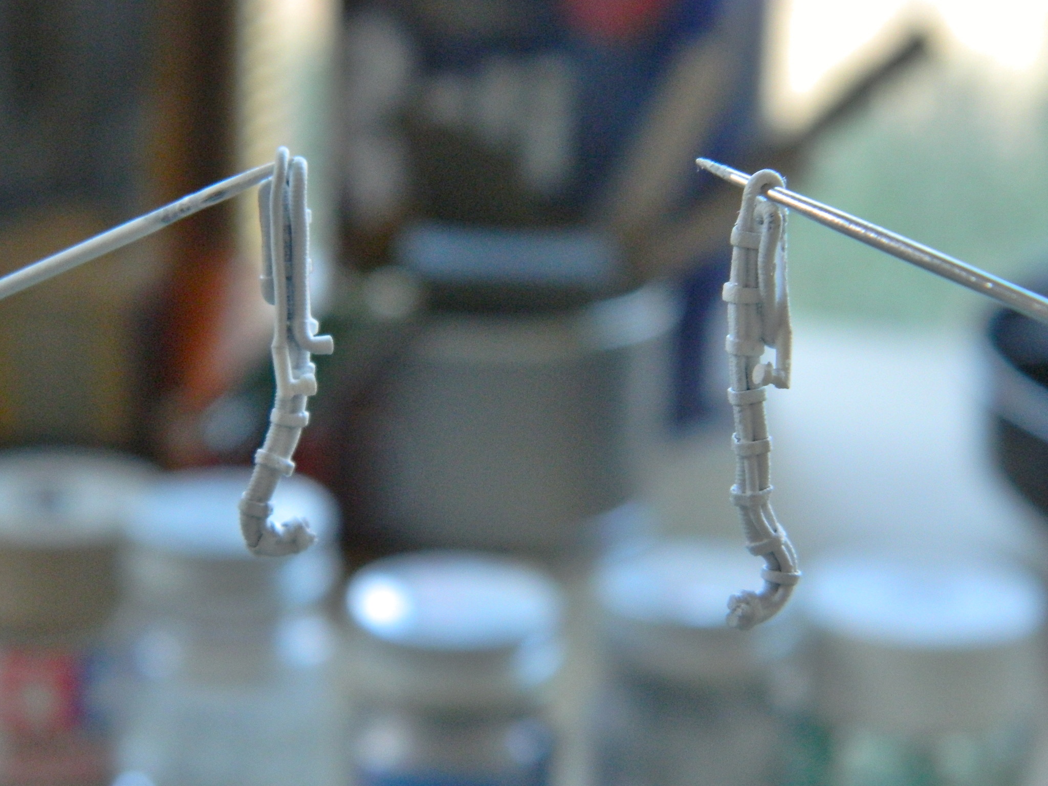 The hoses are made of what feels like silicone rubber; it’s certainly flexible enough to be and I needed something to stiffen them so they’d hold the shape I want. There’s also a communication cable bundled with the hoses which gave me the chance to use a copper wire to allow me to bend the hoses to the desired shape. I used lead foil for the straps and solder for the suit connectors (and of course I drilled out the ends of them):