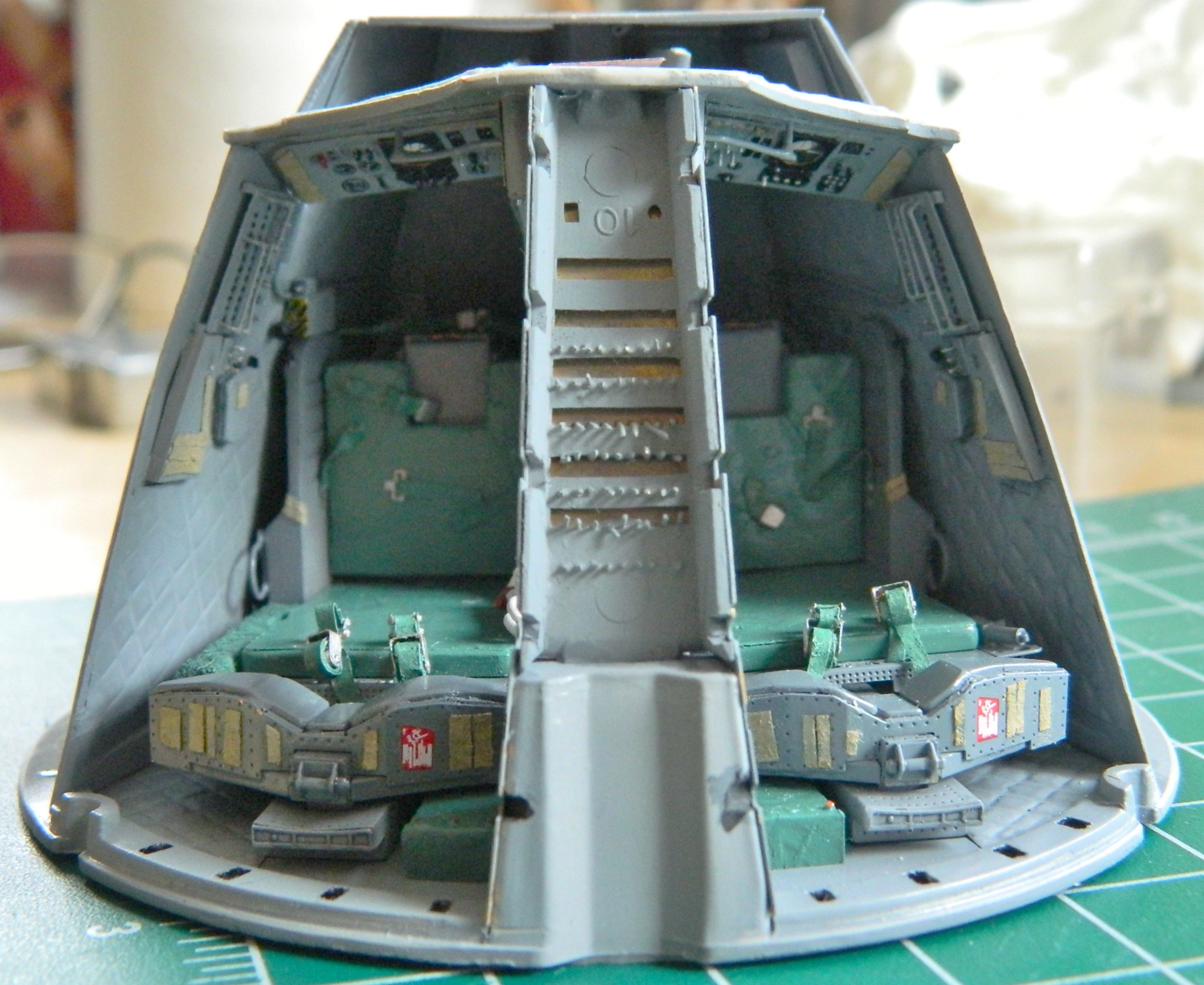 When my head ceased exploding (like, the next day), I started checking references to see where it was off (other than…well…EVERYWHERE). The seats on the actual capsule don’t sit as far back as what I had sitting on my bench: