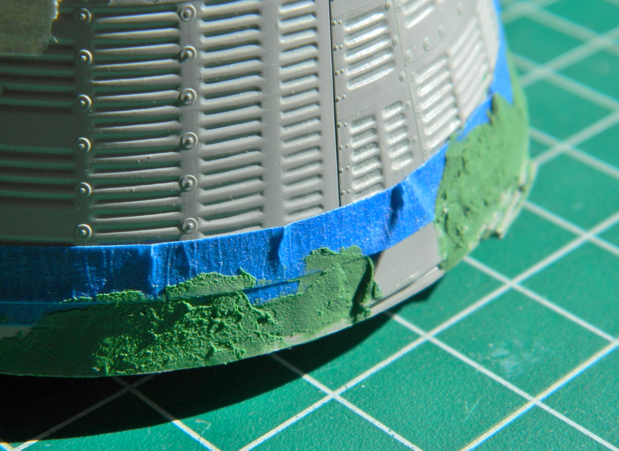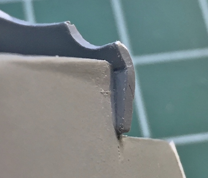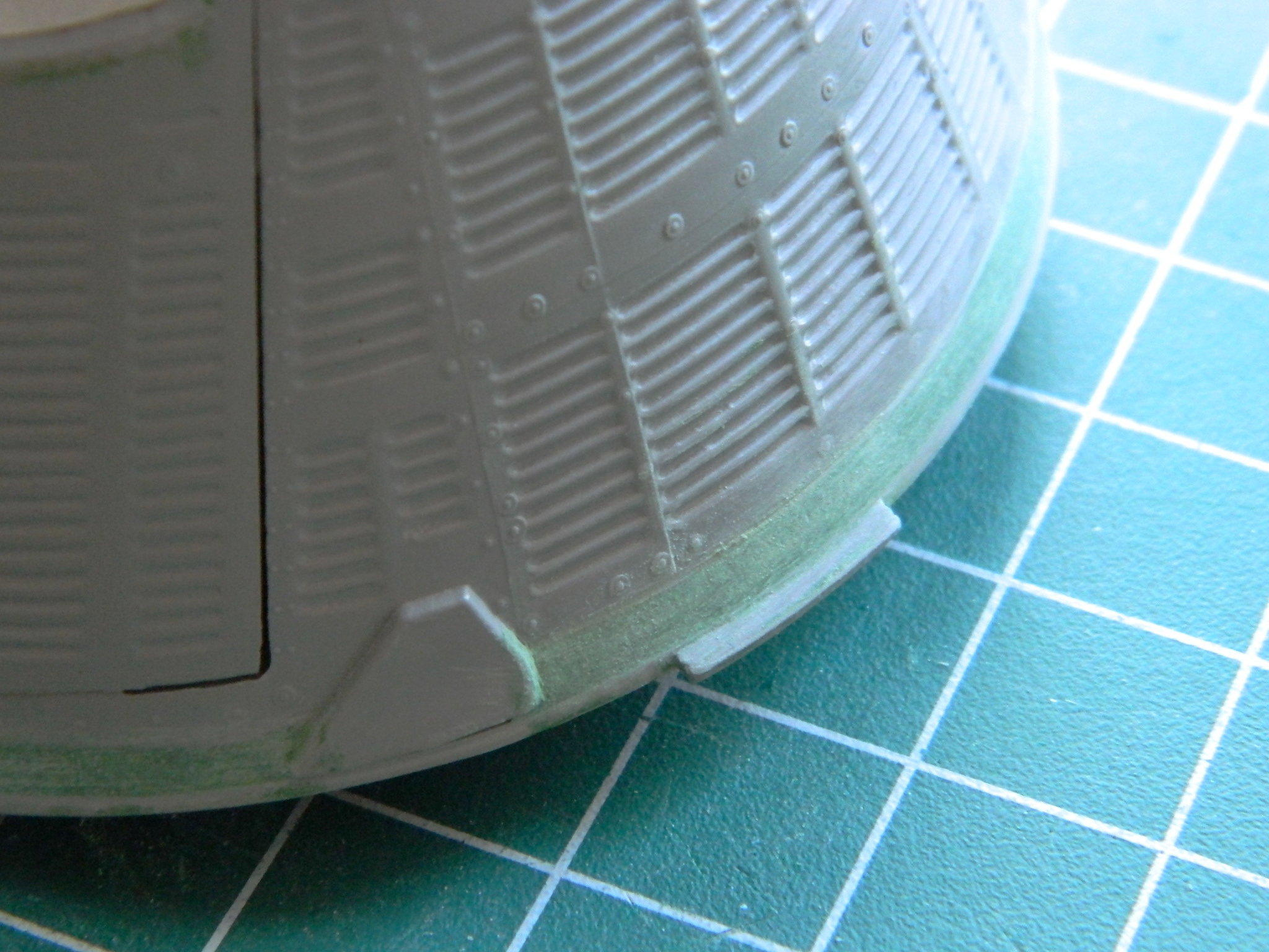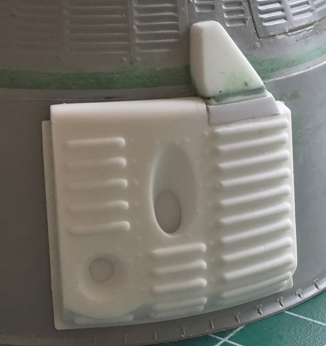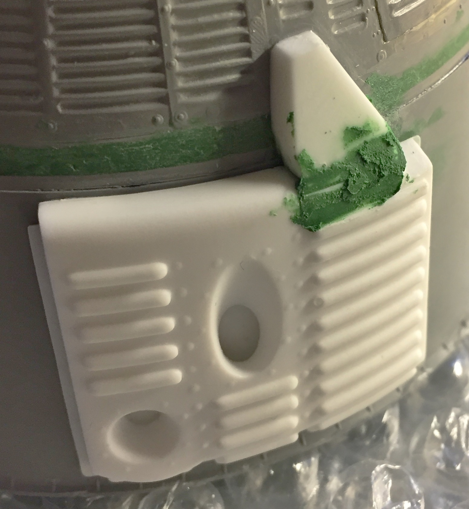 Initially it seems like an easy fix. Just file down what extends past the edge of the capsule and add plastic to where the heat shield doesn’t quite meet the edge of the capsule. The problem with that is that this heat shield also has to fit the top of the retro module and if I did that, it wouldn’t fit at all. I had to make the edge of the capsule conform to the shape and edge location of the heat shield. Putty time: