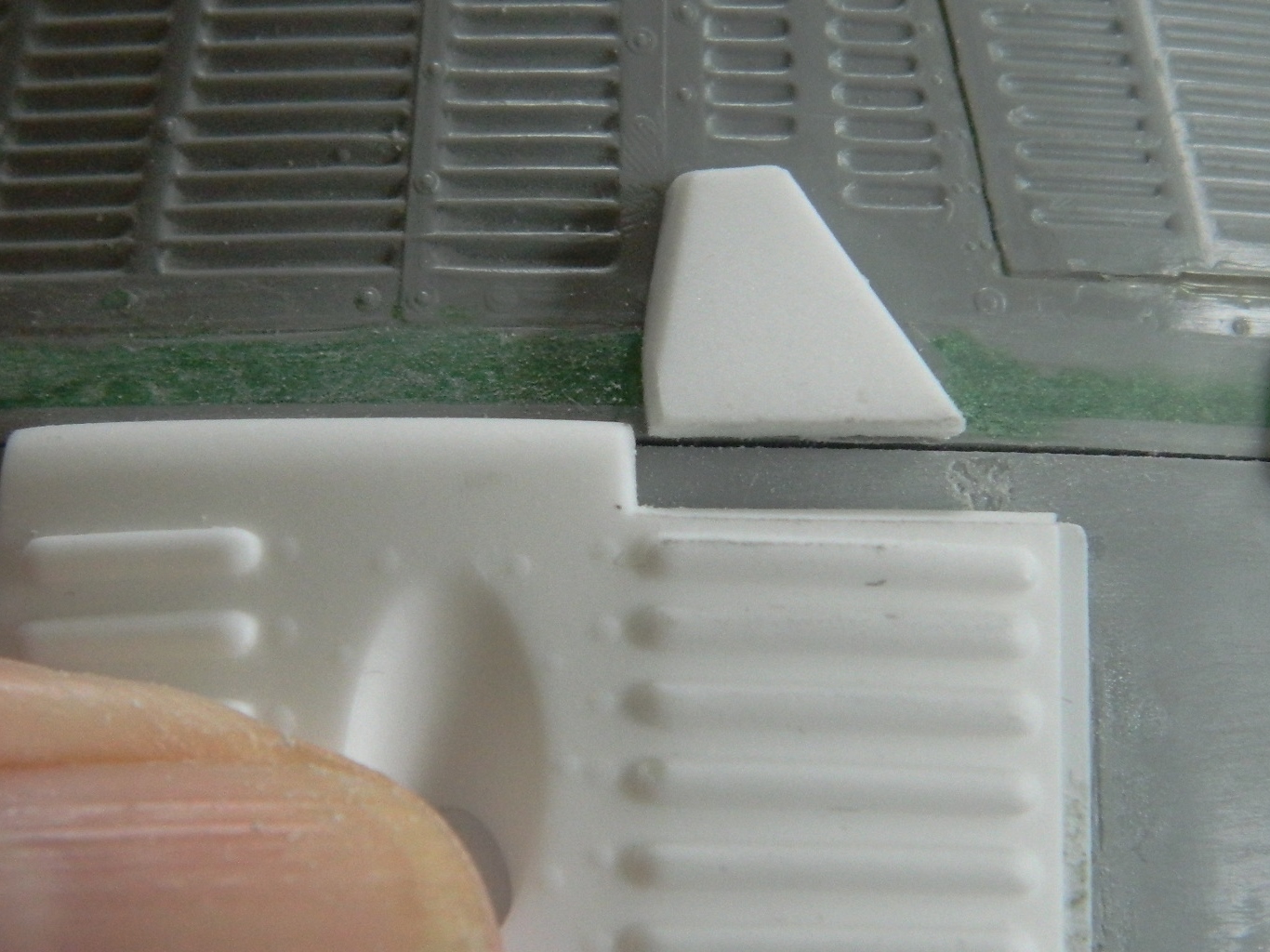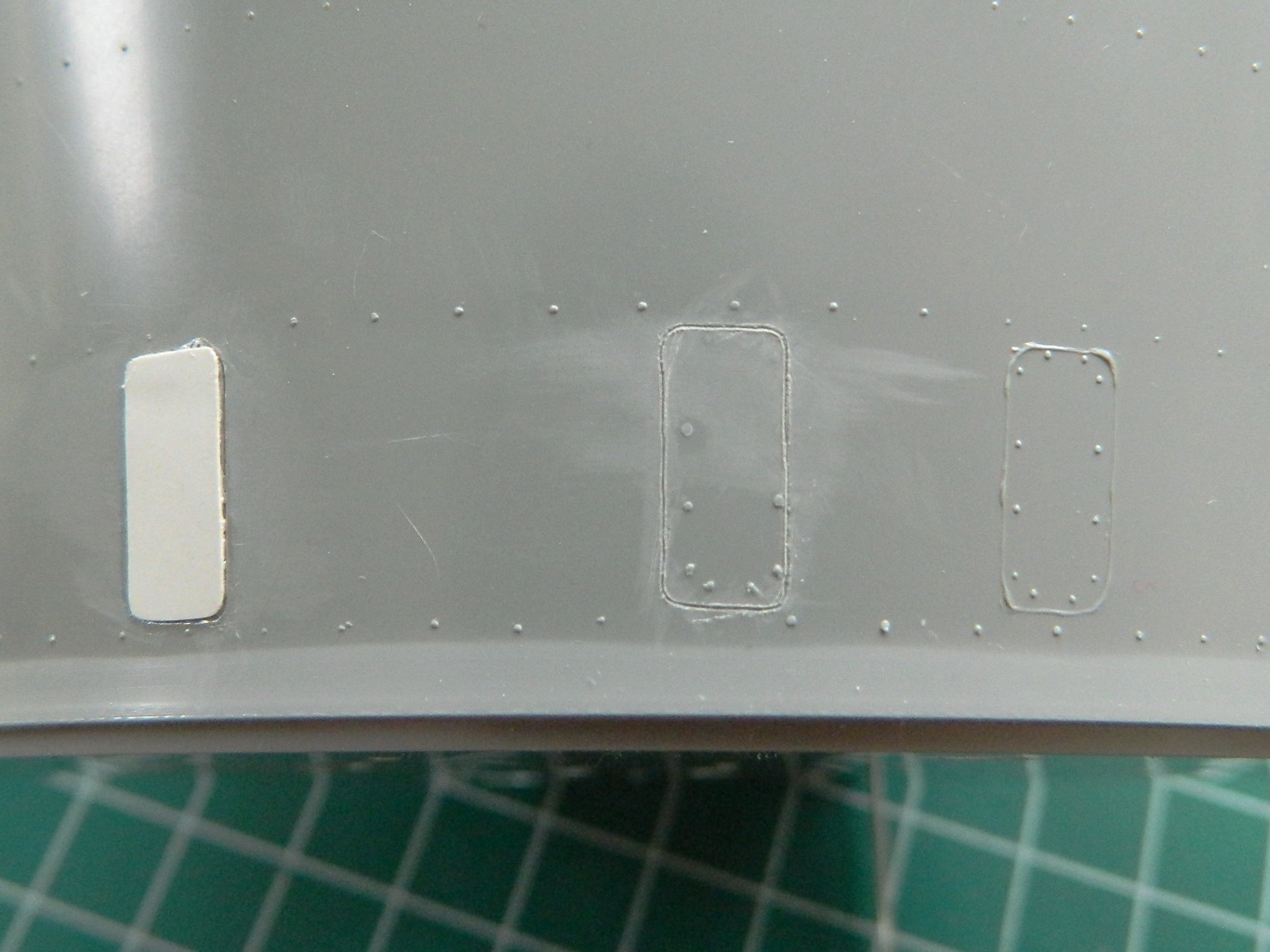 Major problem with that task is personal. I hate scribing panel lines. Thus far, no amount of practice has made me any better at doing it. (Hmm…maybe I can get a job with Revell cutting dies?) (Meow). This photo shows the abysmal raised panel lines on the right, my crappy attempt at scribing in the center, and what I finally decided to do instead. Add panels to the surface: