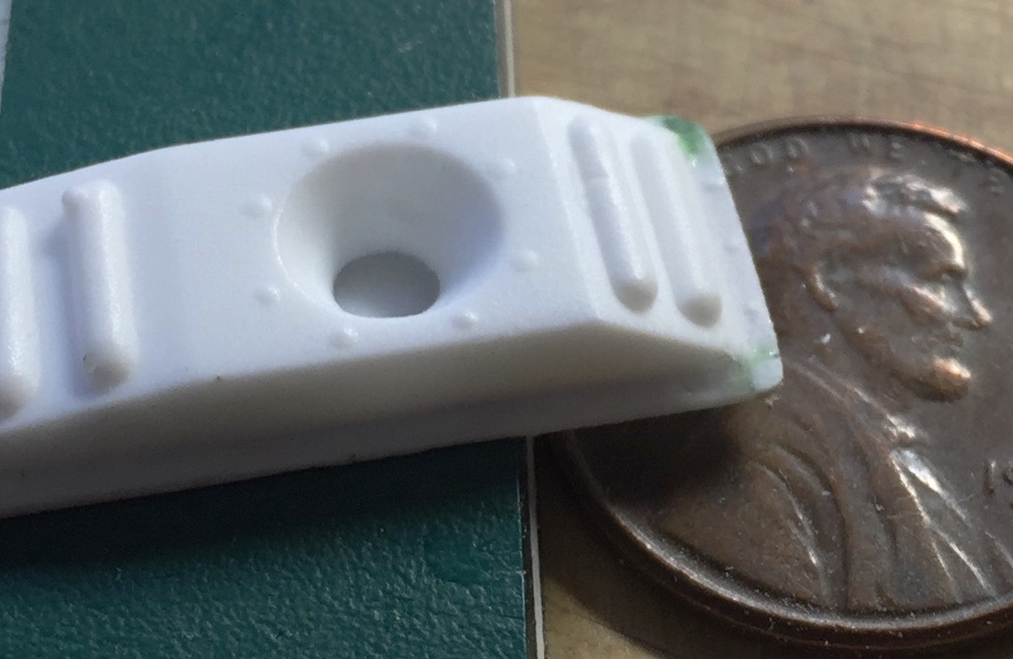 All the problems I’m having with the kit parts were engineered into it, guaranteeing problems. I don’t think that was Revell’s intention, but that’s how it is. In my kinder moments (rare that they are), I suspect the person(s) who cut the dies for this kit wasn’t a master die cutter. I don’t think they were journeymen. I suspect they were new-hire apprentices. And what makes me think that? In the next photo, that U-shaped area is a positive; it sticks up from the surface. That means that when the dies were being cut, the die cutter tool (I mean the tool…I’m hoping the person holding the tool wasn’t also a tool…) skipped across the surface of the die and left a groove behind. And I mean left a groove behind! What sort of quality control lets something like that out of the die cutter shop and into the production area? Nothing I can say would be a “kinder moment”: