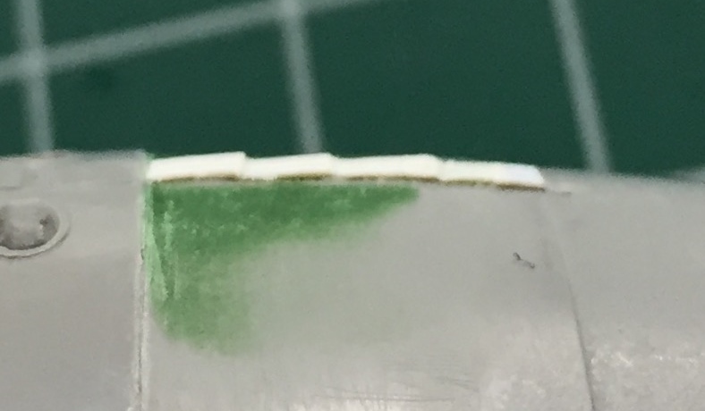 Then the shingles were cut away from the strip and added to the nose. They stuck out too far from the other shingles, and I did not want to replace all the shingles, so those got sanded until they were closer to the correct height (if I sand them any more, they’ll probably vanish). Once done, I added resin rivets: