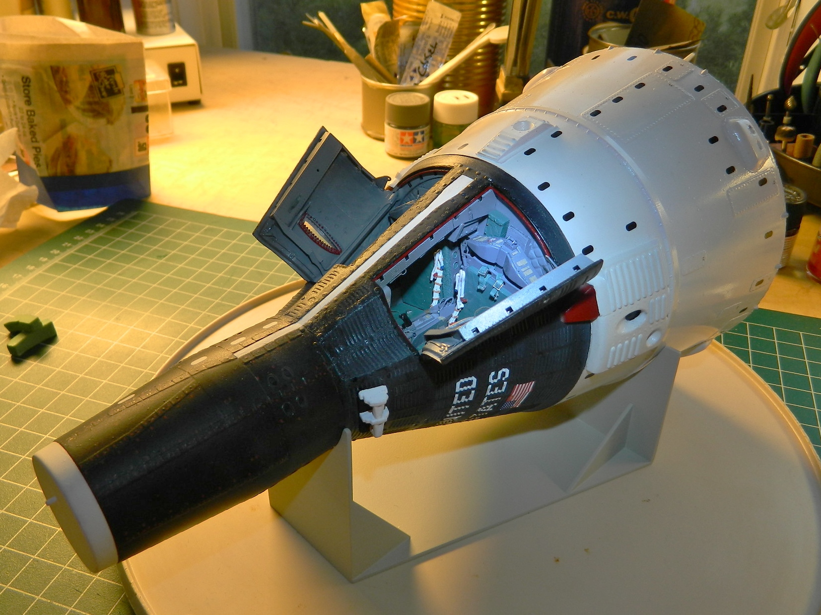 Great build and I feel your pain. I’ve been thru a few of those myself. But…(I can point this out because you said your bar was set higher than most), if you are displaying the capsule in its pre-flight configuration (with the radar section cover attached), you should have built the capsule with the horizon sensor fairing attached. The fairing was not jettisoned until orbit insertion.