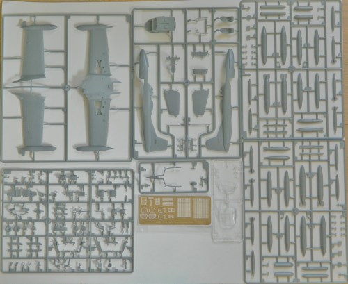 In looking at the parts, I’m impressed in some areas and not so much in others. This kit comes with a small fret of PE parts, so that’s impressive, and so is the quality of the clear parts. Not so impressive are some of the details. Some of the moldings are a bit thick for scale, particularly the fins of the ordinance: