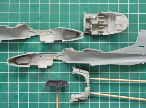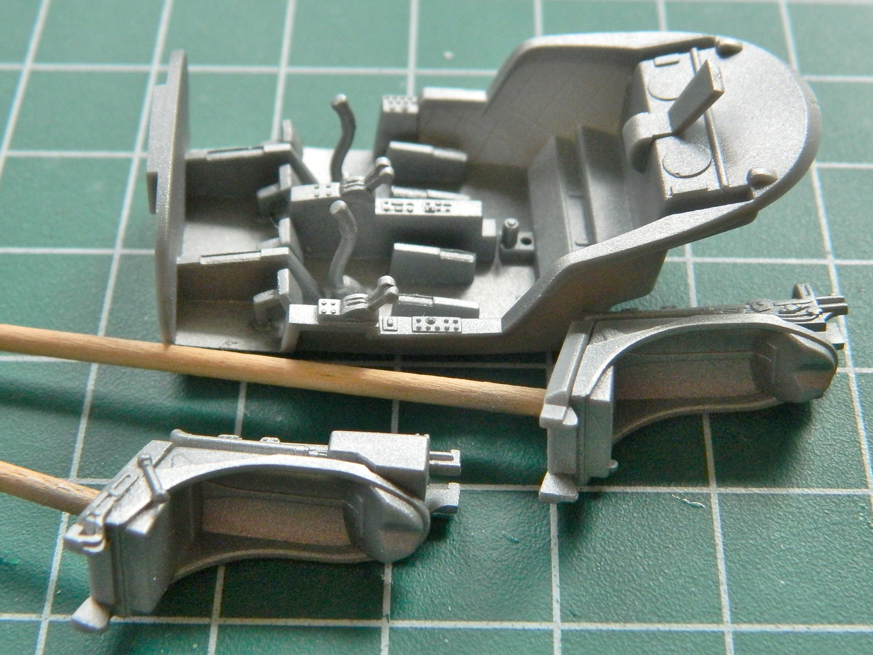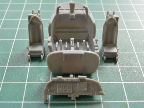 I added all the bits I needed to so that I could paint, leaving the seats out until later. The instrument panel has three parts that sit on top; the gun sight, back up compass, and a radio: