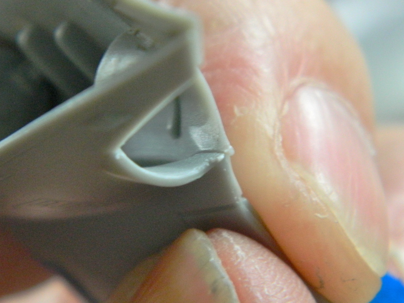 I cut the areas flat to allow for a greater surface for the glue to work on and tried two ways of adding more plastic; a piece of scrap (top) and a piece of stretched sprue (bottom) to see which would work better:
