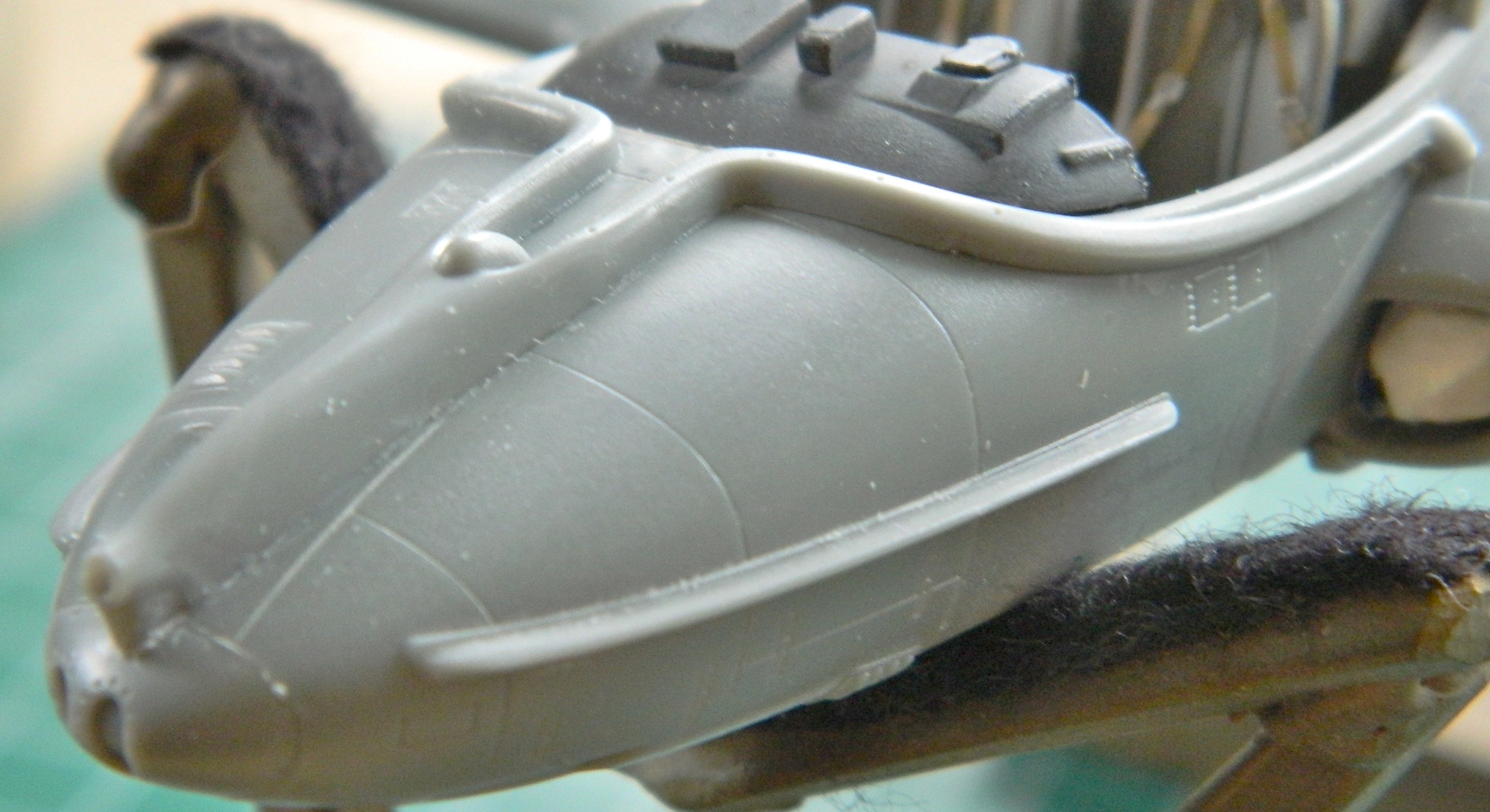 There are strakes on either side of the nose. The kit has them molded a bit too thick and rounded, so I covered the surface to keep from damaging surface details and thinned them a bit and sharpened the edge a little: