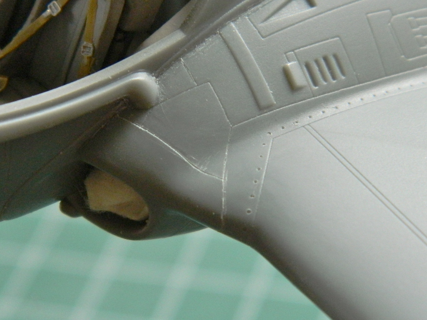 Scribing panel lines raises little “feathers” of plastic. Being lazy, rather than chase them all down, I use a small amount of styrene cement and painted the scribed lines. The glue causes the tiny feathers to dissolve into the plastic and vanish. The “rivets” were mostly sanded away during the fitting of the intakes (and in a few other places) so I replaced them with a small drill as well: