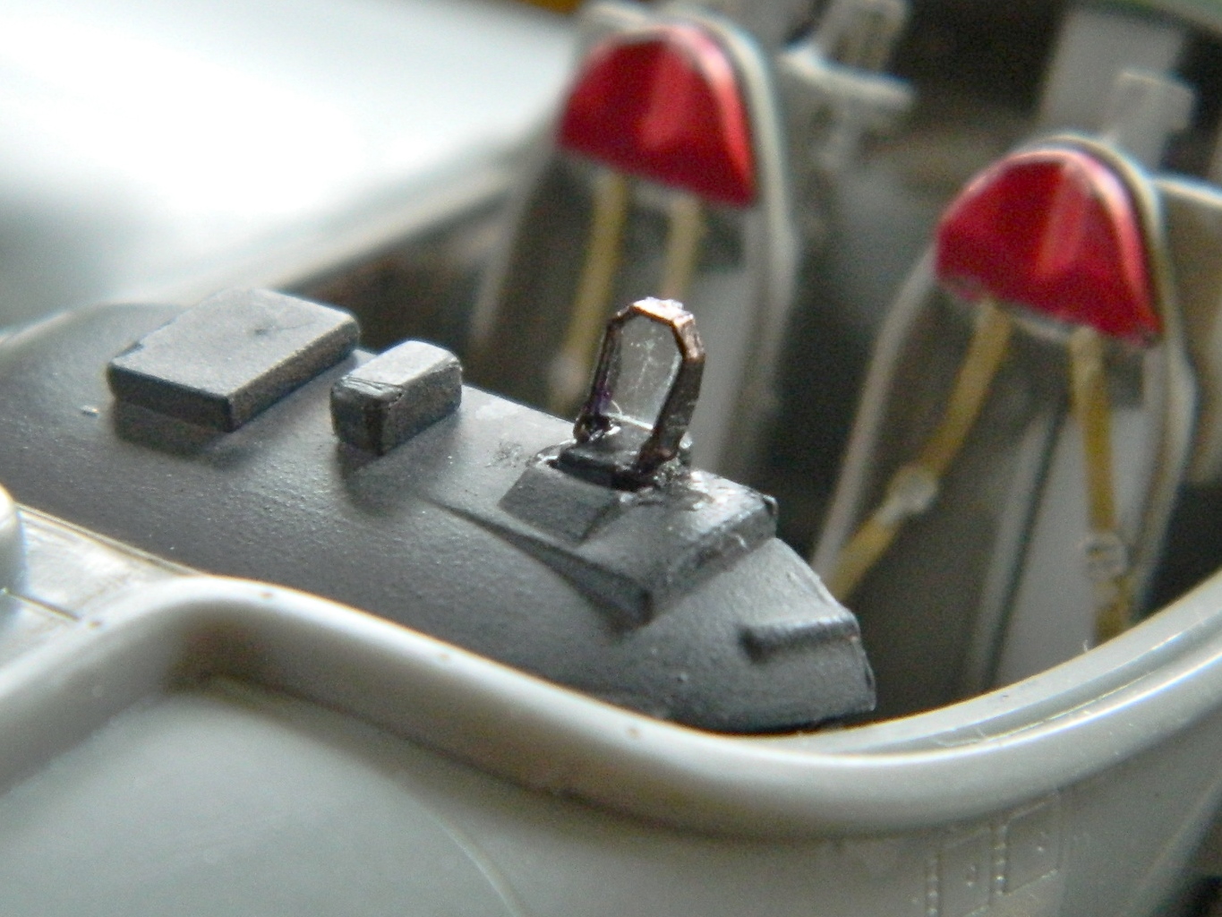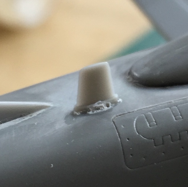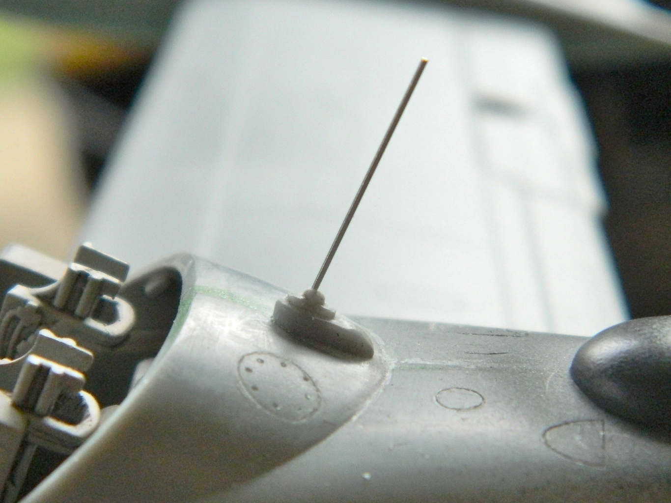 I wasn’t pleased with the paint job on the black dorsal hump. The edge of the white primer underneath could be seen under certain conditions, so I stripped the paint off. I also added other antennas and a vent to the top. Of course, once I’d added the antennas, I didn’t pay attention to where I grabbed the fuselage and laid one of the antennae over on its side. I pried it up, glued it back into its proper place, and tomorrow after the glue has fully cured I’ll rework the surface to remove the marred area: