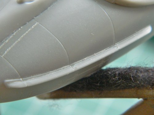 One of the interesting things I noticed was that the panel lines that wrap around the leading edges of the wings don’t match up. I sanded away the ones underneath and rescribed them. Later on, I noticed the page with the load call-outs a saw that the mistake was also done on the printout: