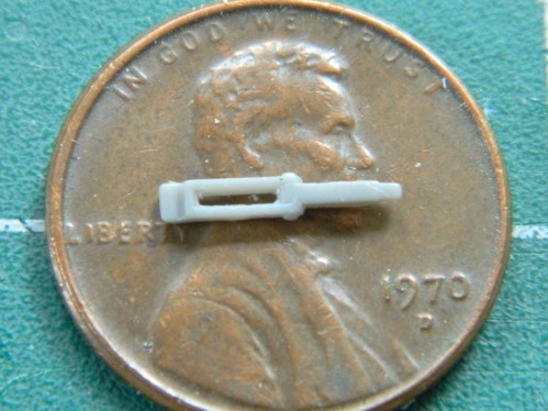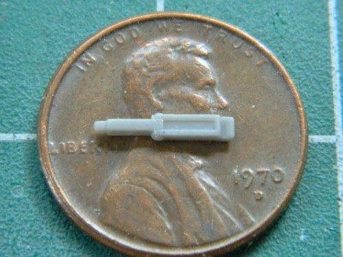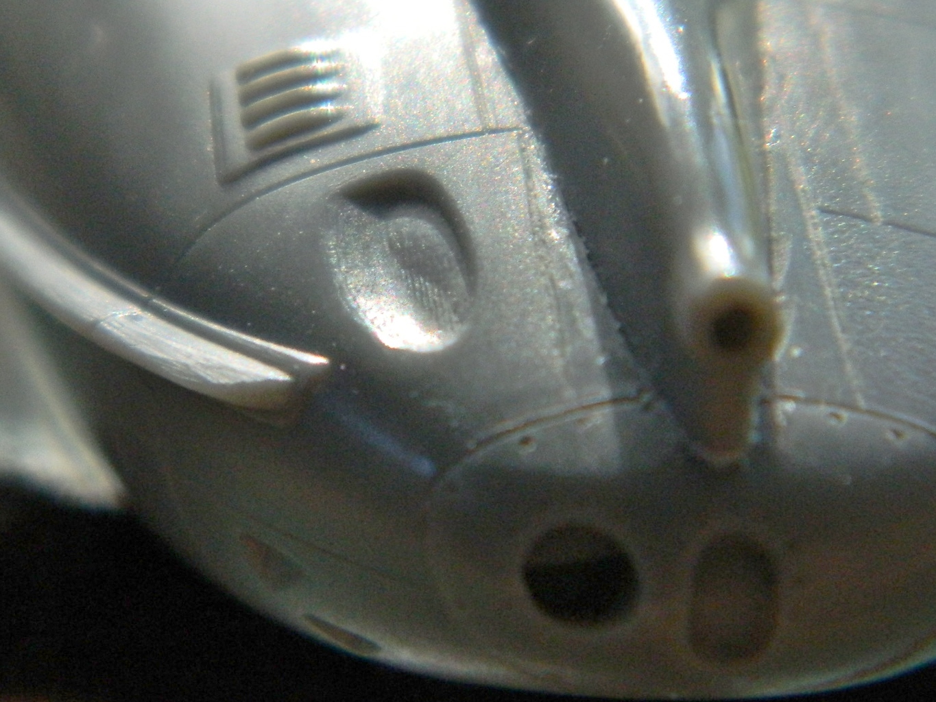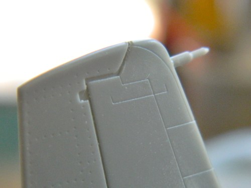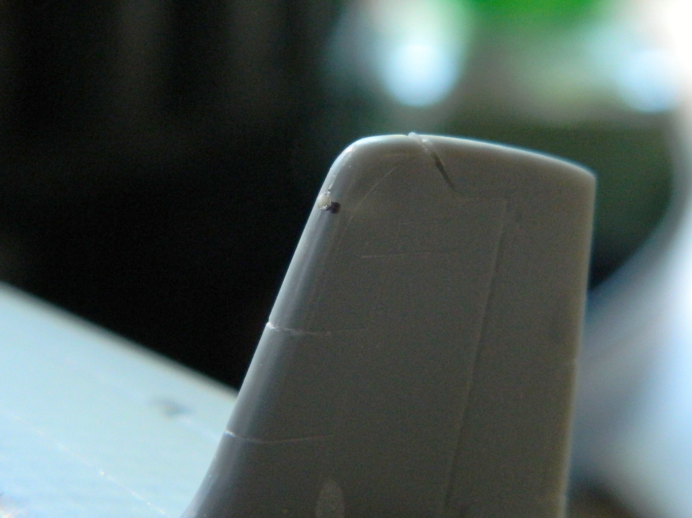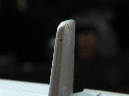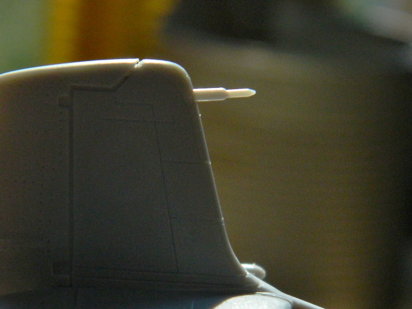 At the top of the vertical stabilizer a pair of antennae are supposed to be attached. There’s a problem with that…the antennae that are supposed to be mounted to the plastic is .005″ (.127mm) thick. That’s not enough surface area to keep them there (a gnat landing on it could cause one to pop off), and the attachment point is a very fine recessed line which helps as much as a screen door on a submarine does:
