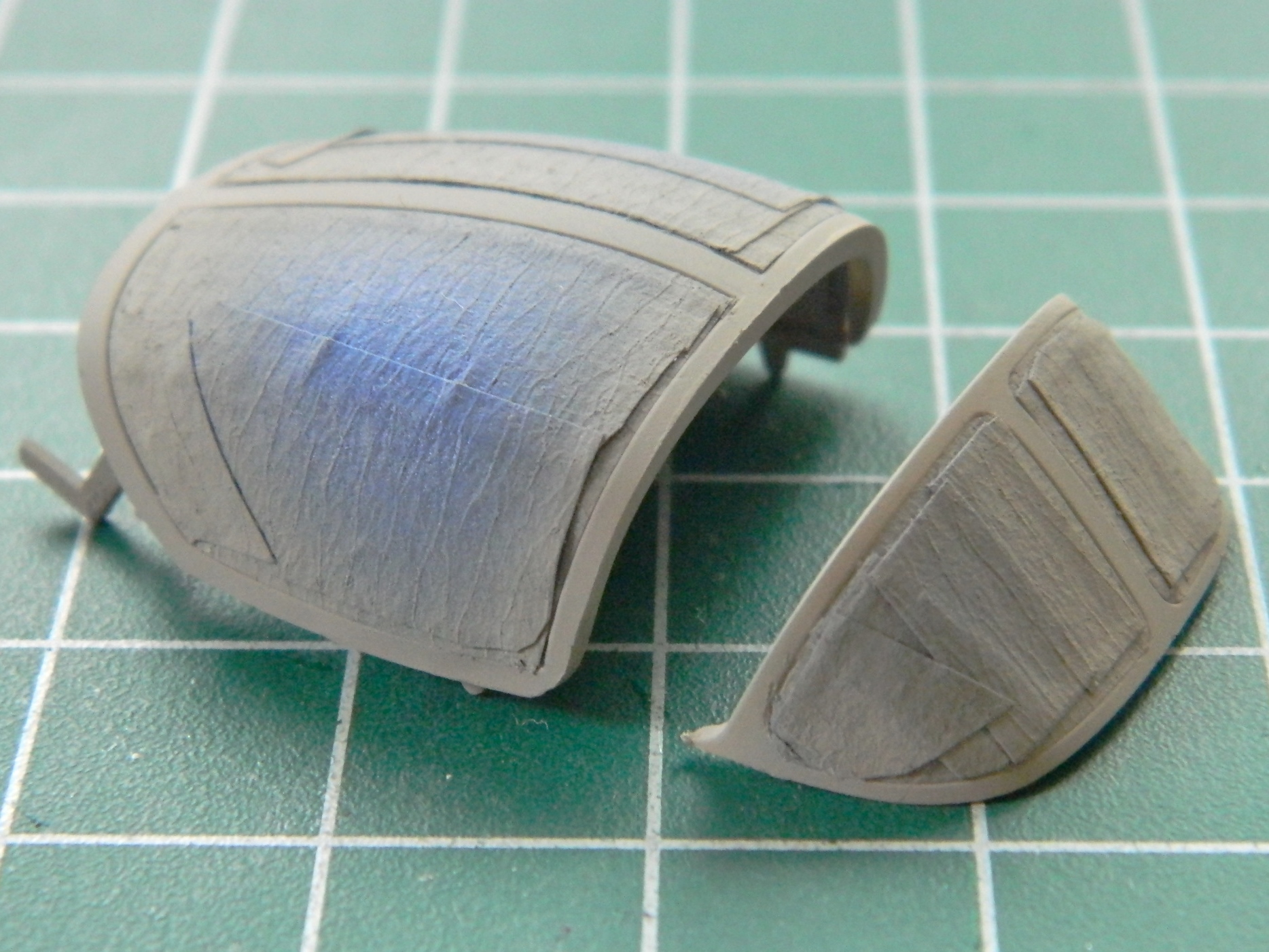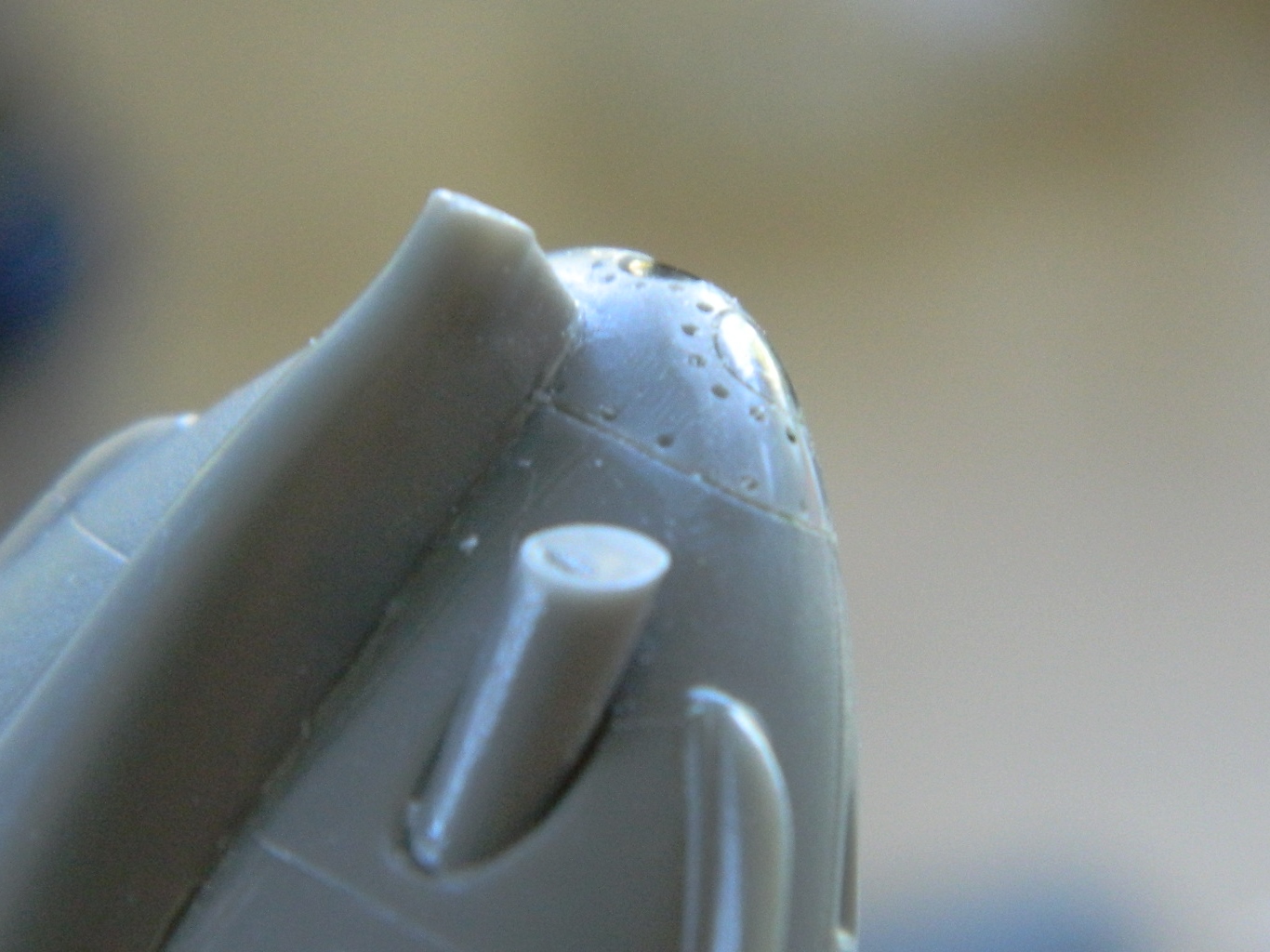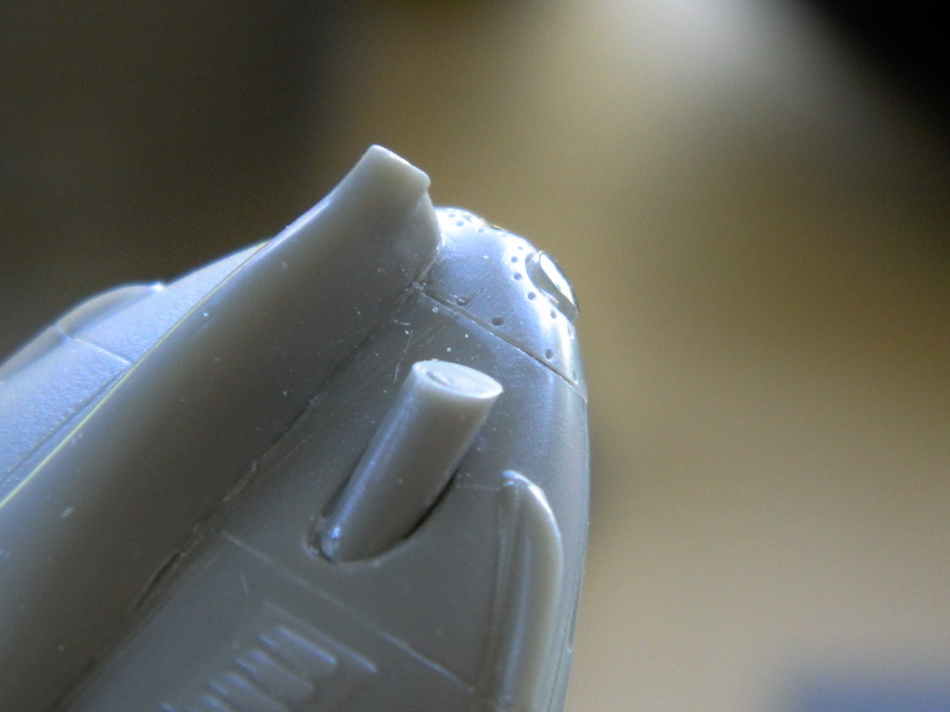 I filed the protruding area to fit the curve of the nose, then used successively finer sandpaper until I’d removed all the sanding scratches. (Had it been a canopy, the next step would be to polish it…for hours…but it’s not so I didn’t) (and also note how nicely the gun shroud sits in its oval mounting area):