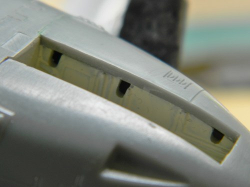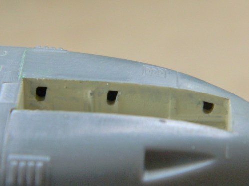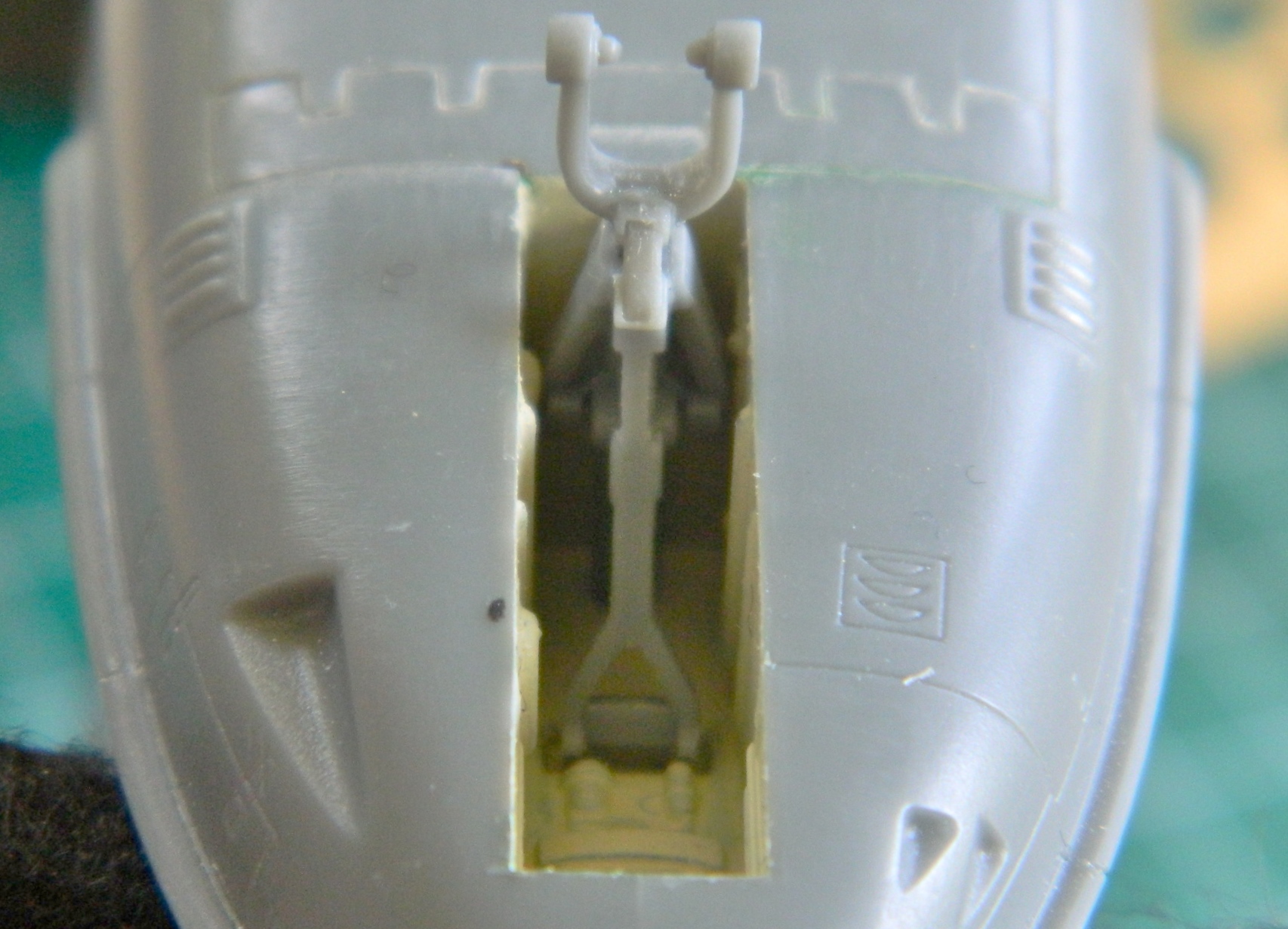 The color of the nose-wheel bay needs to be brought down to the fuselage and to do that, I needed to fill that gap with putty and paint it: