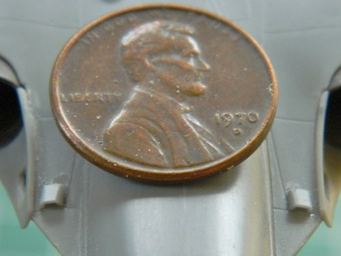 While dry-fitting the gun shroud, I found it didn’t fit correctly. It didn’t settle down into its recess enough and the oval ramp-like area to the left is why. That will need to be cut down (later). At the nose of the fuselage are areas that will be getting clear parts installed. The round area is a landing light and the oval area is…well…I dunno what it is. I just know it’s clear, it’s the size of a large grain of rice, and it certainly had me concerned (they both did, actually):