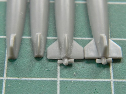 When I started assembling the under-wing stores I noticed is that some of the stabilizing fins are far too thick. Those had to be thinned more to scale: