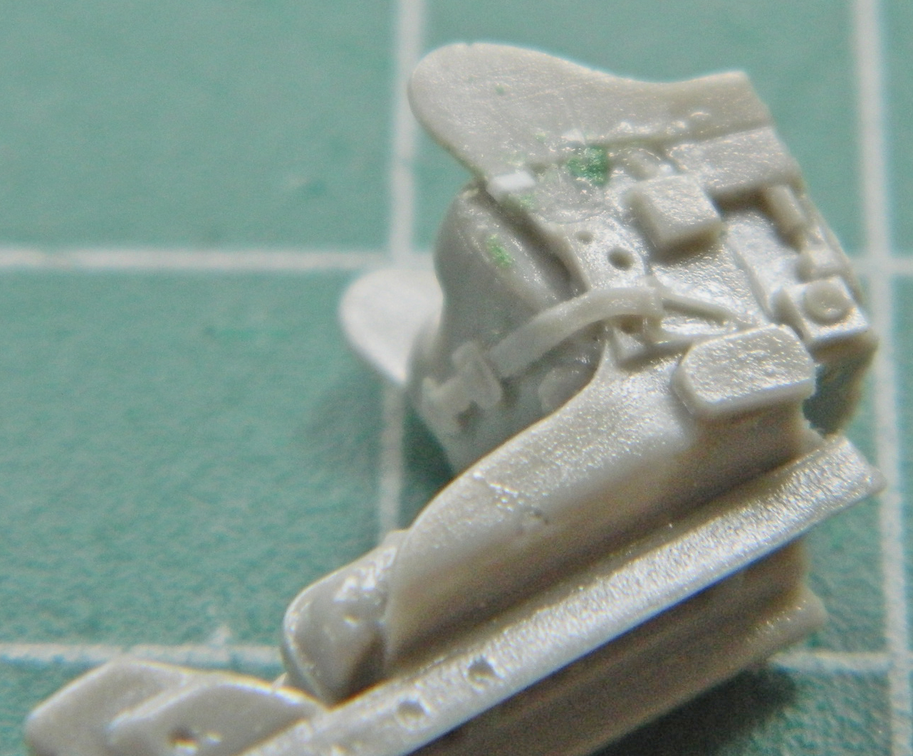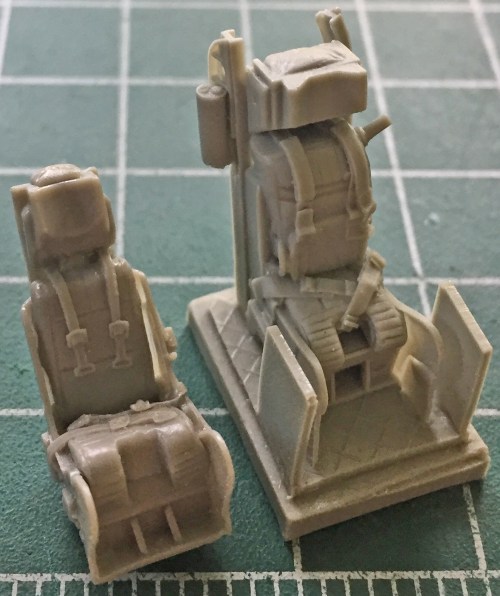 I had purchased a cockpit detail set from True Details and, totally forgetting that I had, also purchased a pair of ejection seats from Pavla Models out of the Czech Republic. My oversight ended up offering me more options. Neither of the ejections seat sets was 100% accurate, each had something the other lacked. My choice became, which of the seats’ errors/omissions would be easiest to fix? As it turned out, I’m going to use the Pavla seats (the one on the left; part of what makes them look SO different in the photo is that the True Detail seat is still attached to the pouring block and the Pavla seat isn’t):