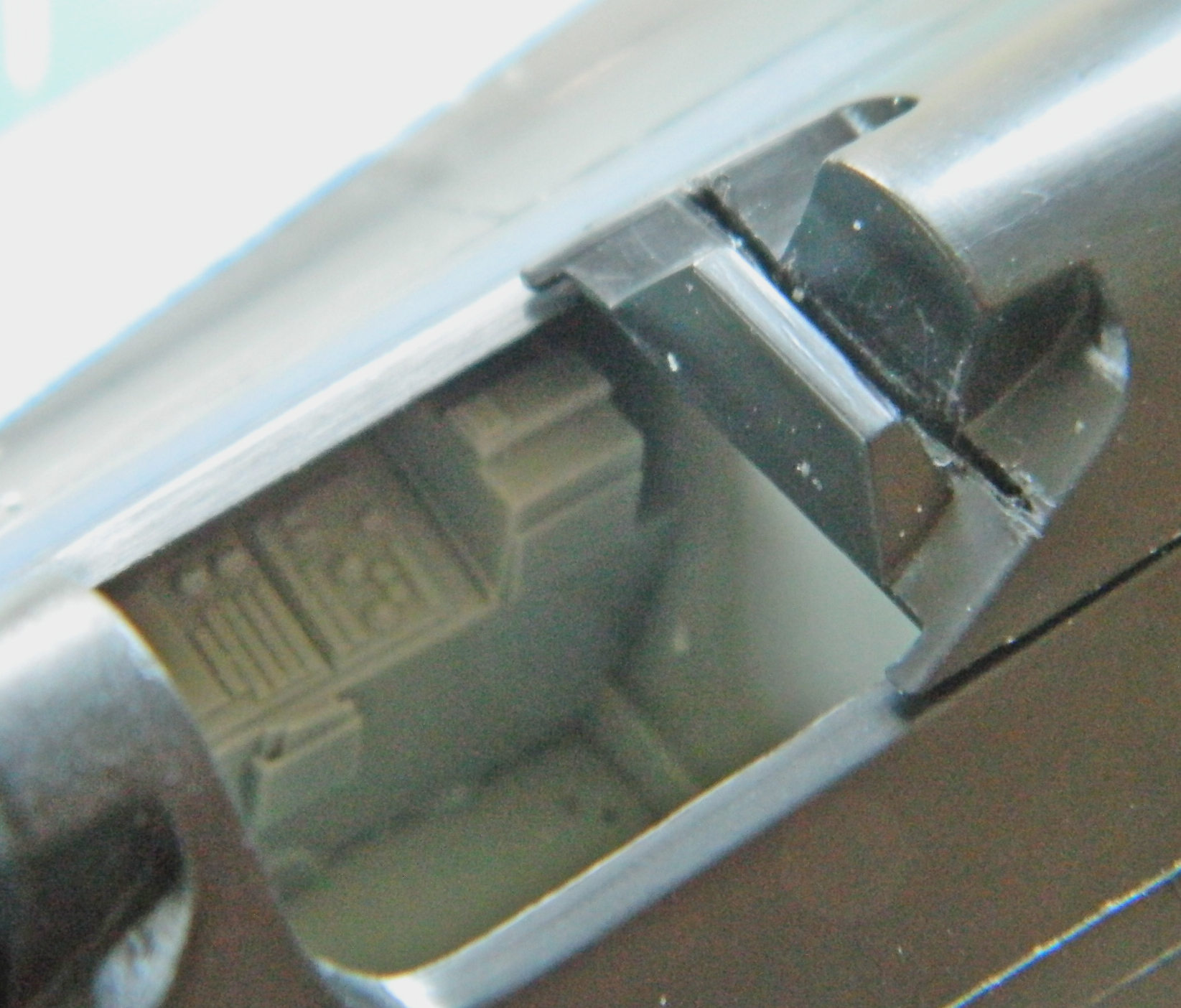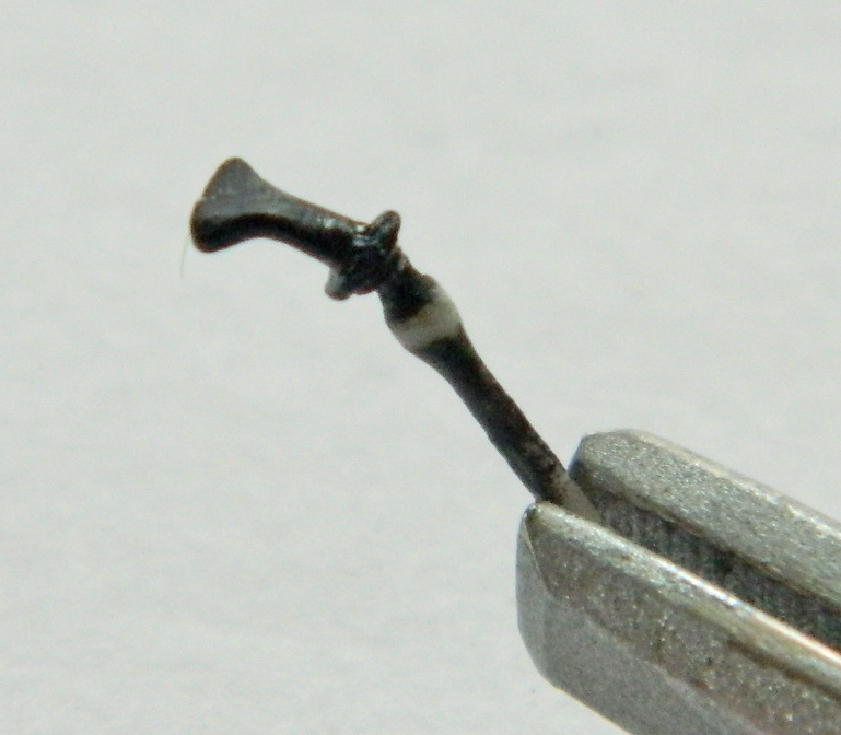 The only thing left to do is to add the four buttons (three on the top facing the pilot, one on the other side), but I’ll do that when next I’m in the mood for extremely tiny things (right after my medications are adjusted). The grip has been shortened, the bulge added, and the main shaft replaced with styrene rod: