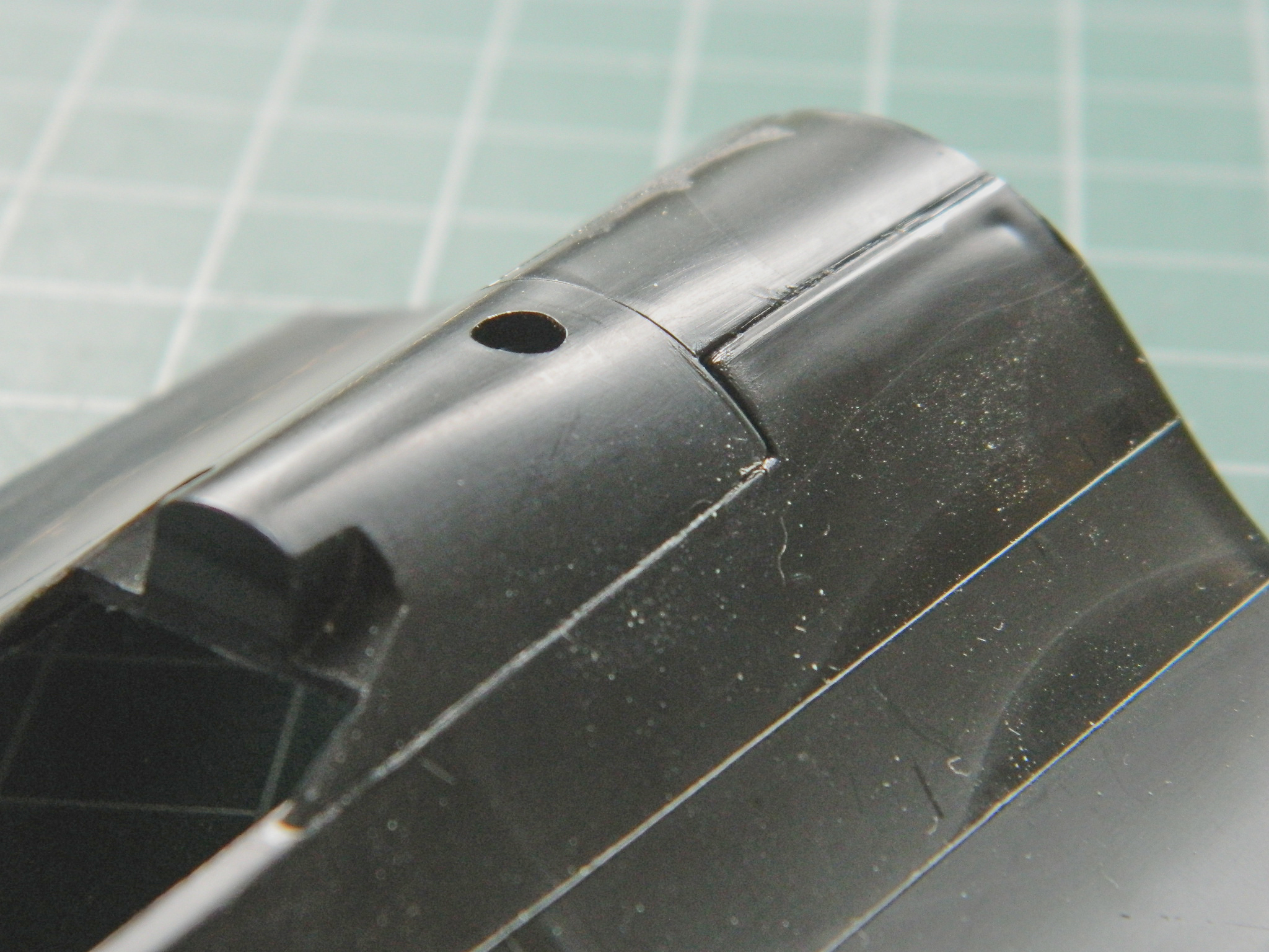 The seam where the wing attaches isn’t supposed to be there, either, but once the seats are installed in the cockpit tubs, those seams won’t be visible…but the gap at the top will be. I tried putty to see if it would adhere to this particular resin and it doesn’t. That meant I had to fill the gap with styrene and finish it to invisibility…so I did: