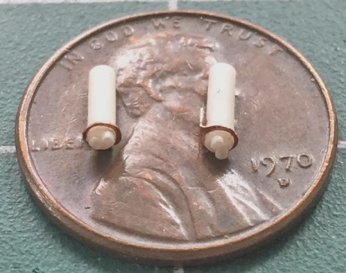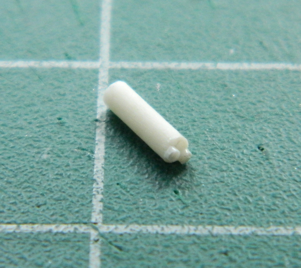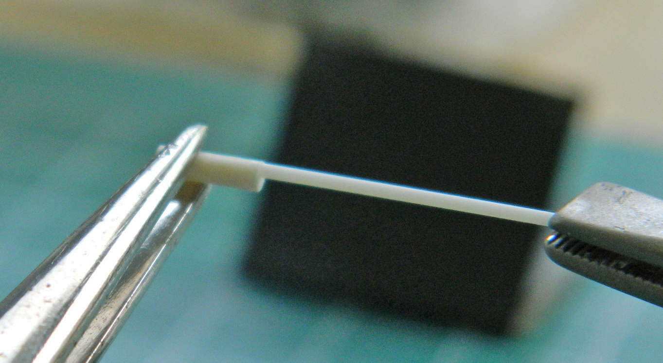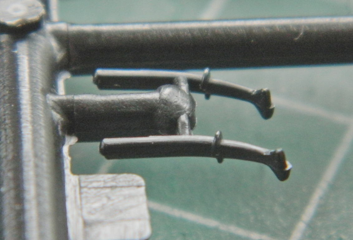 One the side near the top there is a cylindrical “thing” with two lines coming out of it. I used 1/16″ (.062″) (1.58mm) styrene rod for the body and .025″ (.635mm) styrene rod for the fittings. I used the True Details seat to determine the length of the body and then used locking tweezers on stands to align the rods and glued two pieces on: