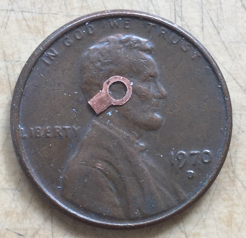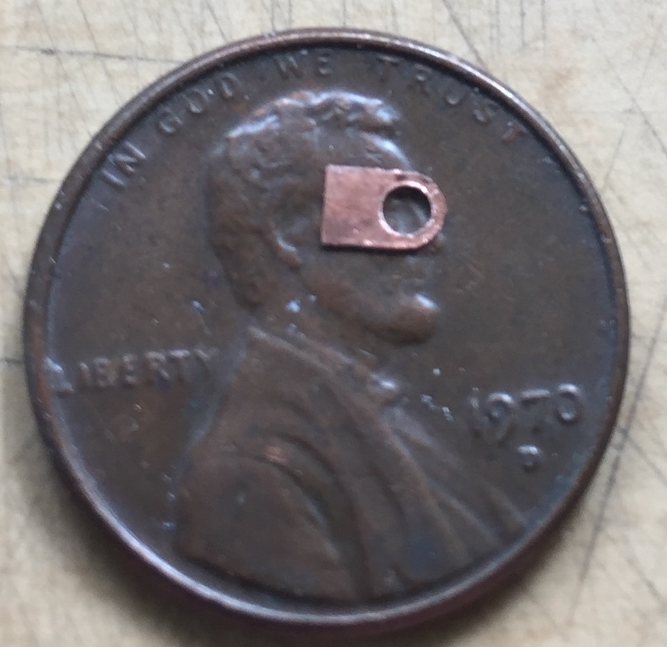 These cylinders aren’t just stuck to the frame of the seats, they have mounting brackets. I made them from .005″ (.127mm) copper shim stock and used the punch and die set to start the holes and a fine (very fine) rat-tail file to open the holes to the appropriate diameter. Tip: punch/drill the hole first, then cut to approximate size and use a file to bring the dimensions down to size: