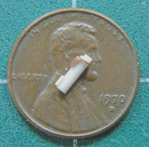 The flange is a little too large. I fixed that by holding the body of the bracket in the nose of small pliers and filed away the excess…and forgot to take pictures. (Perfection still eludes me.) With everything to their final size, I slid the bracket over the cylinder, glued it in place, and bent the mounting tab parallel to the cylinder’s body:
