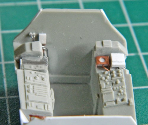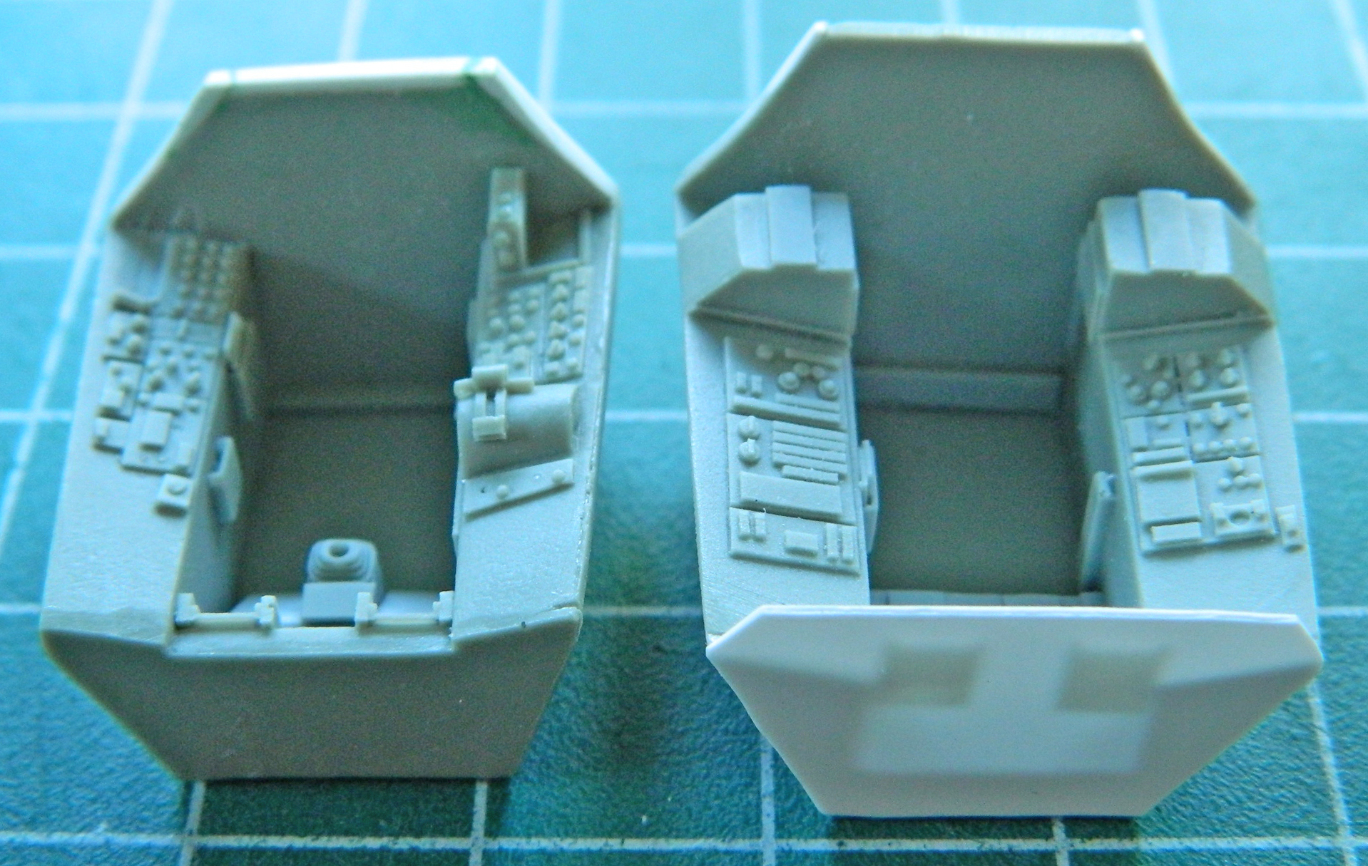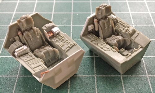 I repeated the process for the pilot’s cockpit…and didn’t take any photos until it was done. There will be a couple of more items added, such as the mount for the canopy opening cylinders, but this is the basic redone cockpit tubs (with the seats just placed in to see how it all fits…and it does) and how it looks: