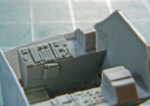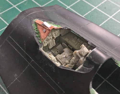 I started this process by making the main body of the side panels, gluing it into position, and then engaging in styrene mosaic to get mass built up in the areas I wanted it, starting with the RSO’s cockpit: