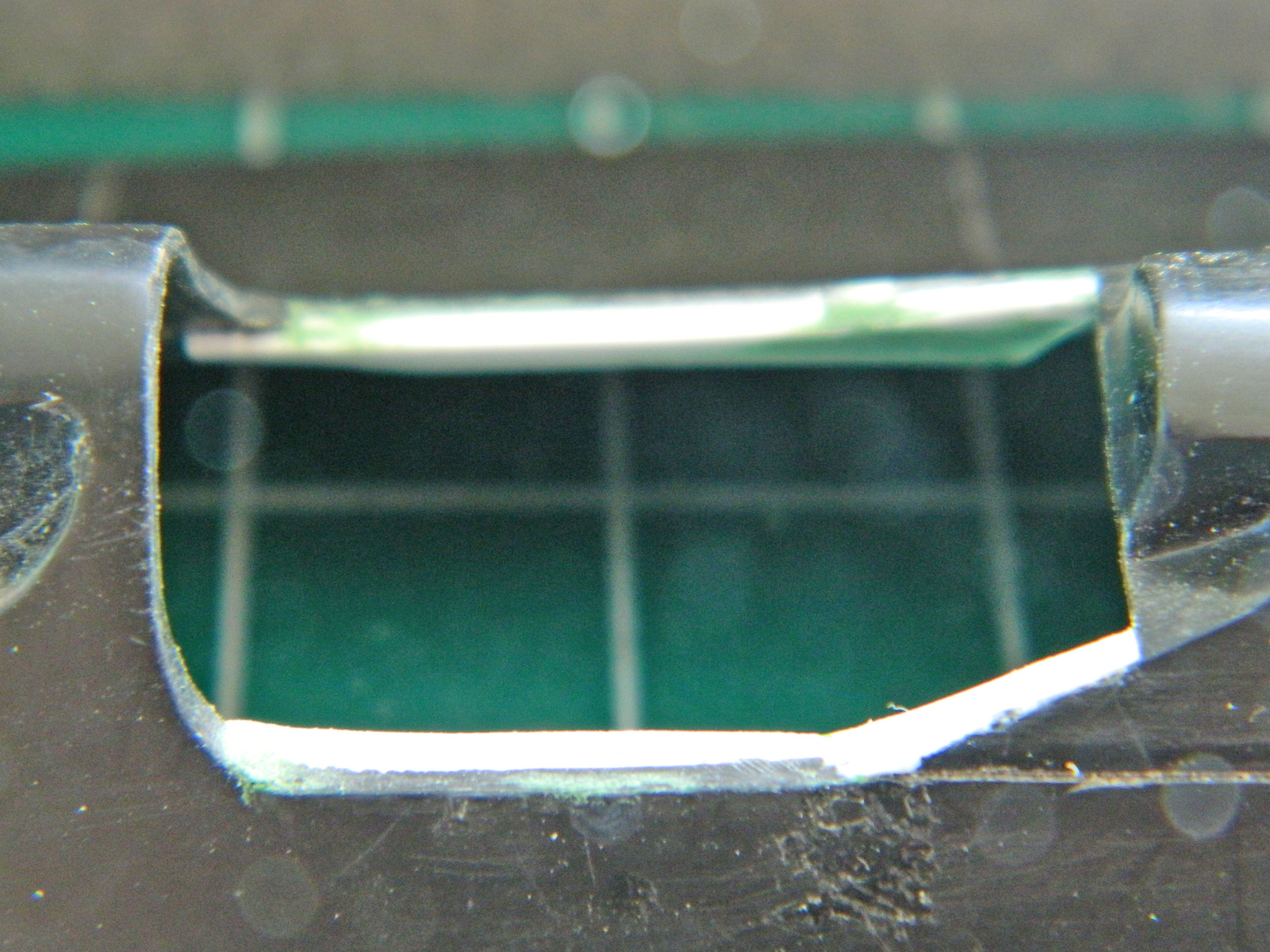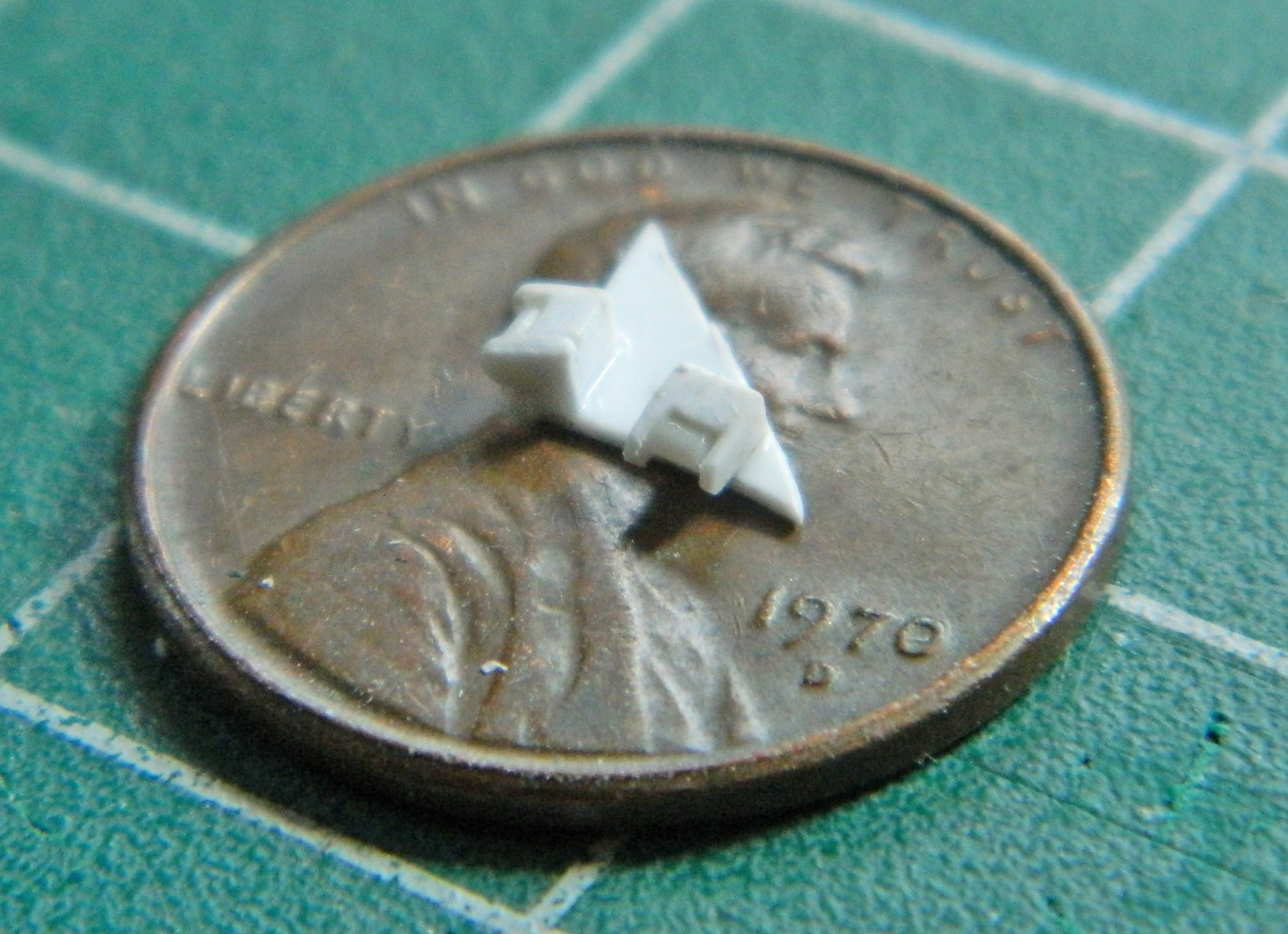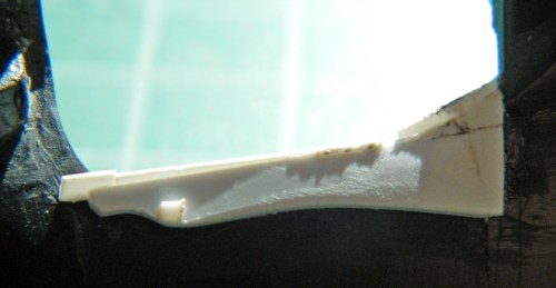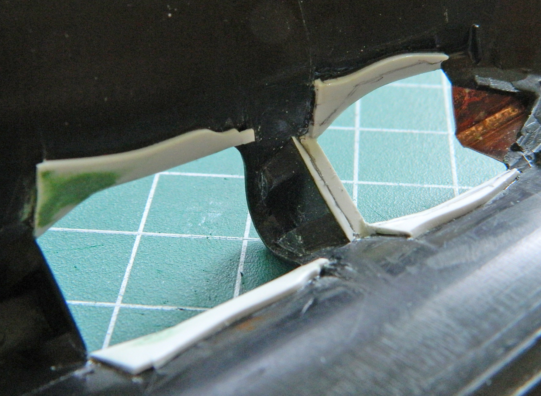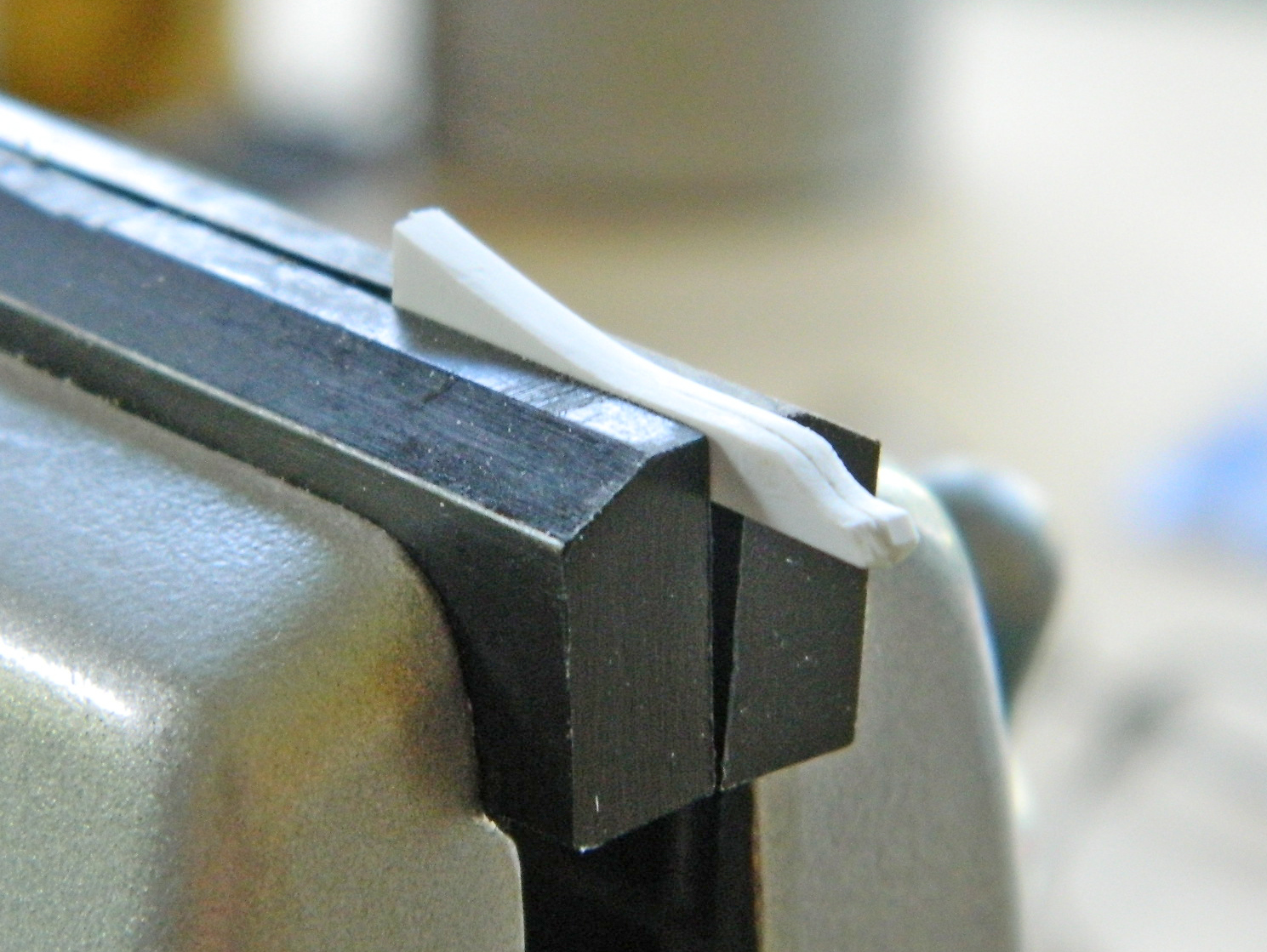 With the bulk of it removed, I refined the shape with a sharp #11 and backed it with a scrap piece of .010″ (.254mm) styrene: