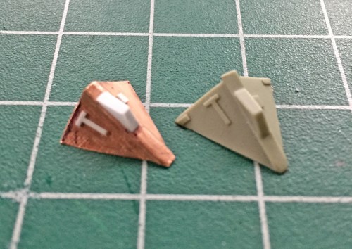 I transferred dimensions from the resin part to the shim stock and roughly cut it out. Because I was going to have to make tight bends in a very small area, I decided to anneal the copper before trying to bend it and thereby remove its resistance to bending. I got it to work:
