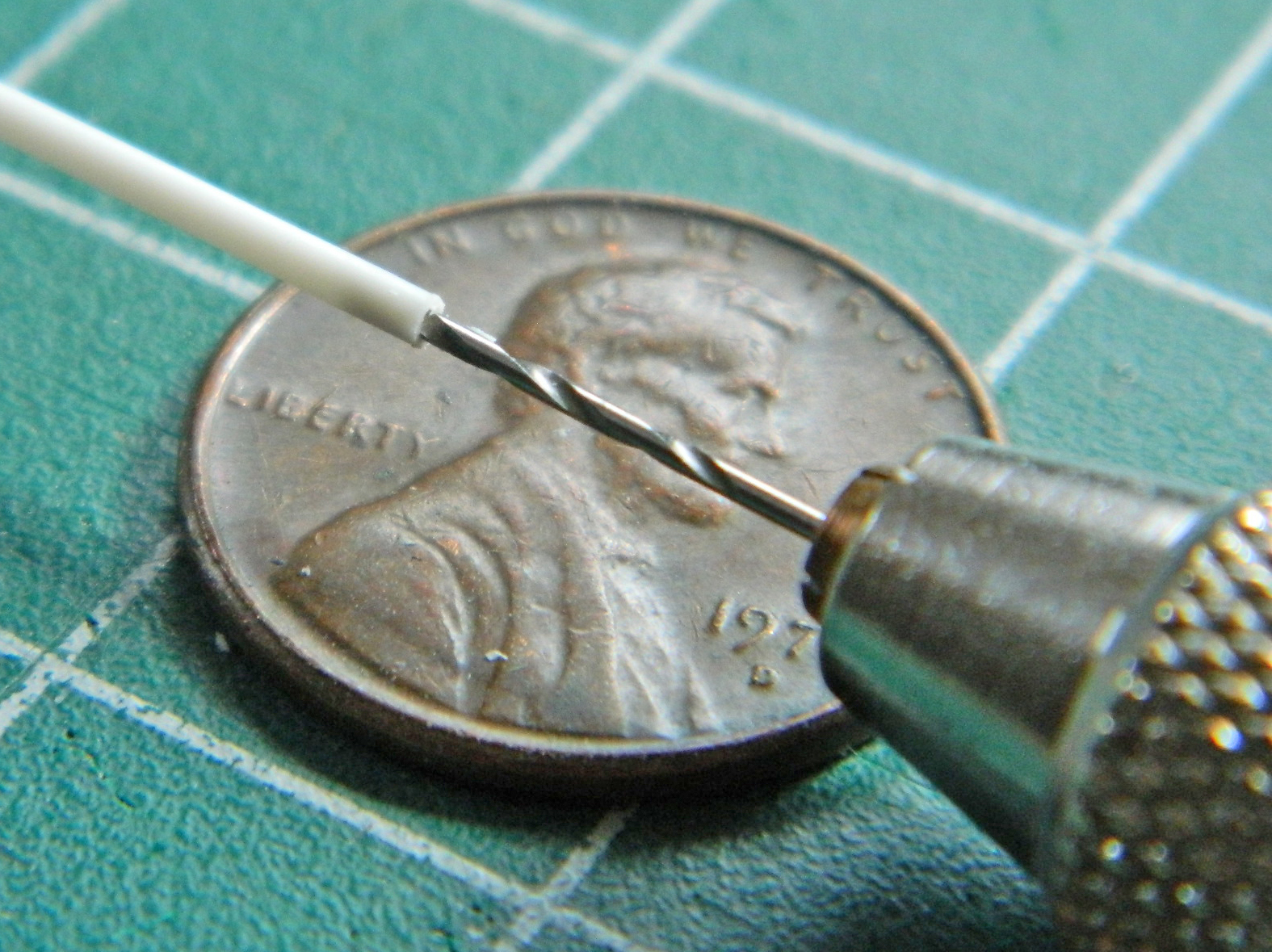 I used .062″ (1.57mm) styrene rod to make the cylinder and .035″ (.890mm) styrene rod to make the rams (the rod that moves in and out of the cylinder). The cylinders are a bit short so that I can adjust them later to fit into the available space. Fitting these things has the potential to be a bitch so I wanted to build in some adjustment. Until all the associated parts are actually mounted, I don’t know exactly how long the finished sub-assemblies will need to be. This started by center-drilling the .062″ (1.57mm) rods to accept the .035″ (.890mm) rods:
