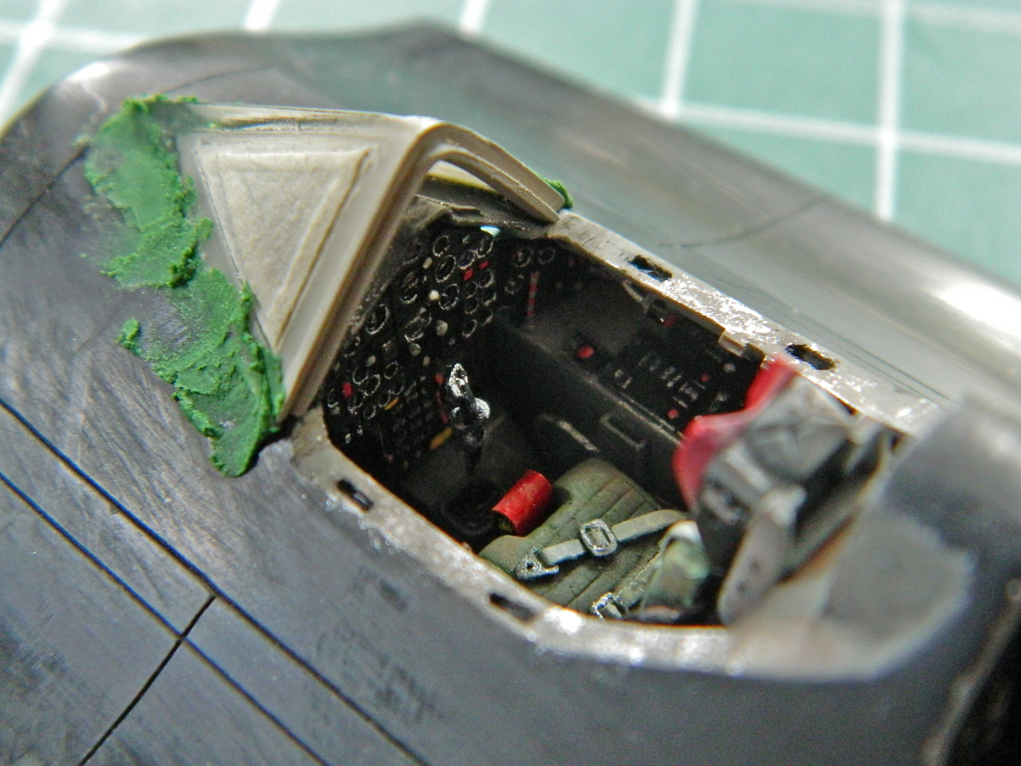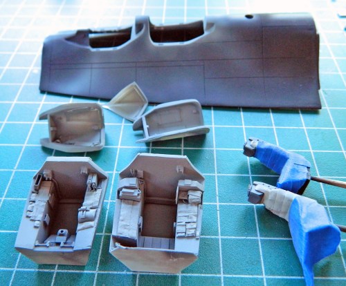 Time to attach these assemblies to the fuselage part. I added the instrument panels first, then the tubs, and then the windscreen: