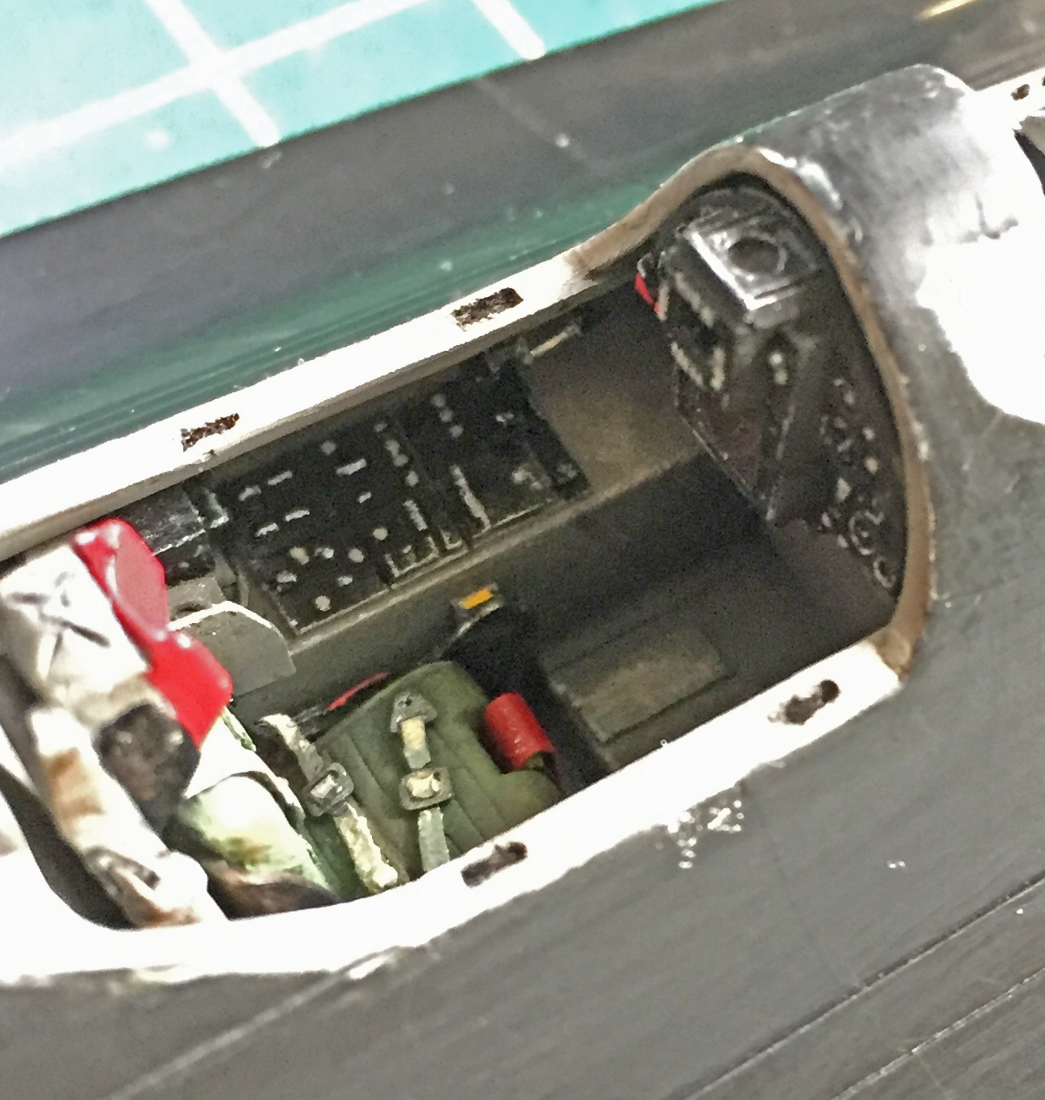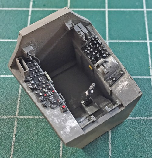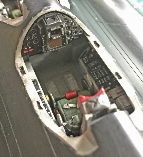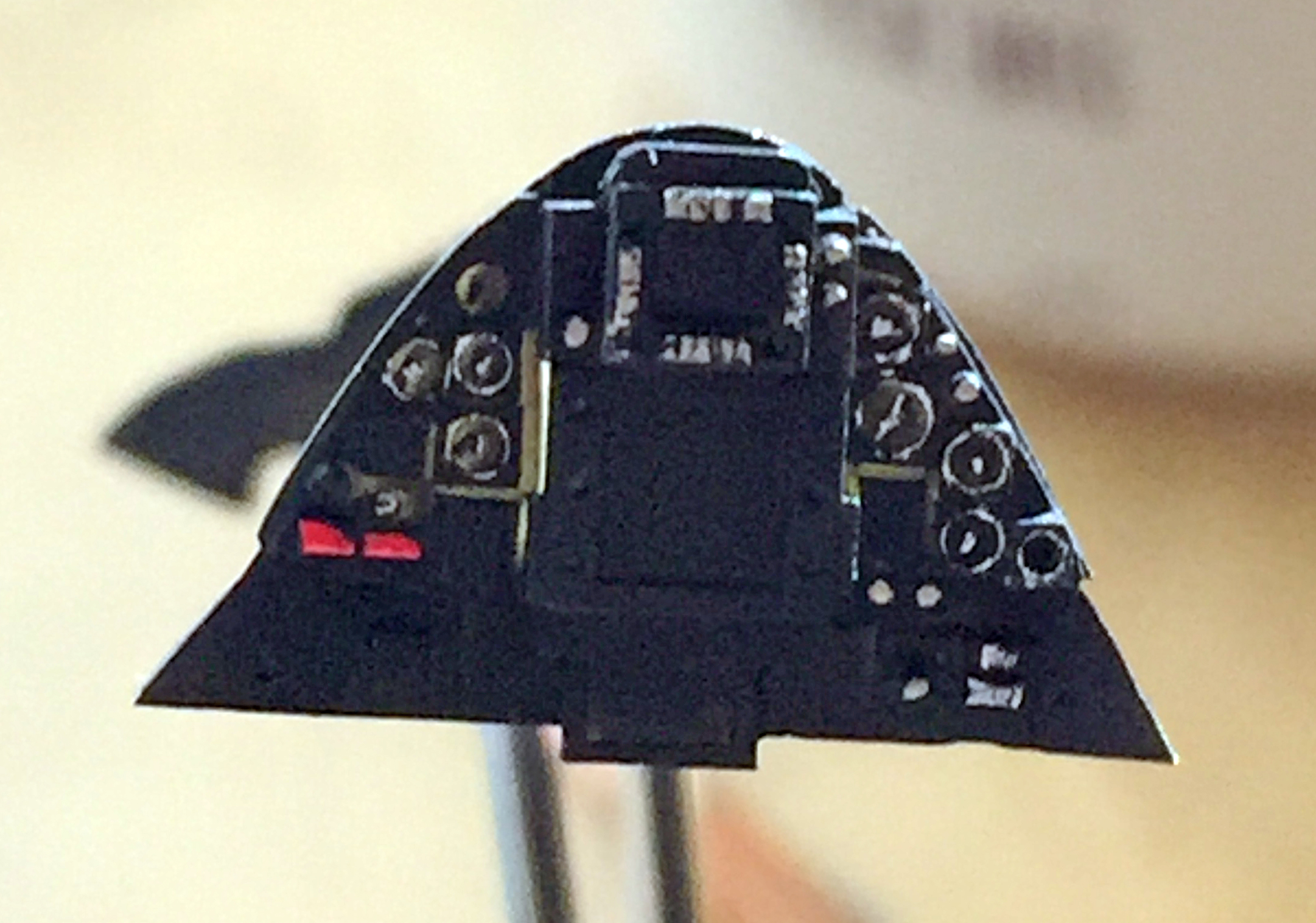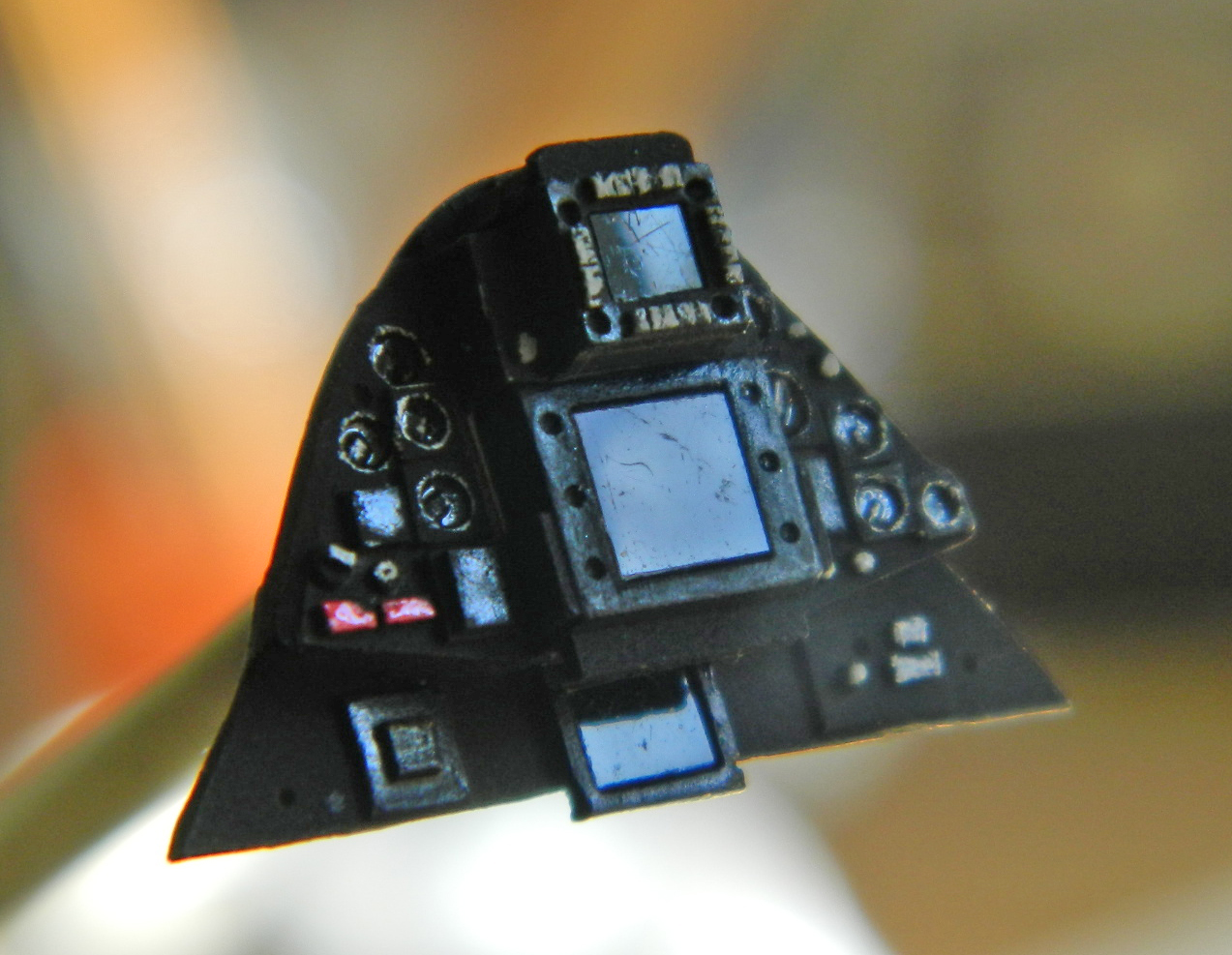With the basics done, it was time to do the really fine stuff. For the pilot’s panel that meant I put a drop of clear gloss on each instrument. For the RSO’s panel, I glued the film I used for the CRT screens into place using diluted white glue (the pilot’s panel also has a small CRT screen under the three center gauges but it’s almost impossible to see) (almost):