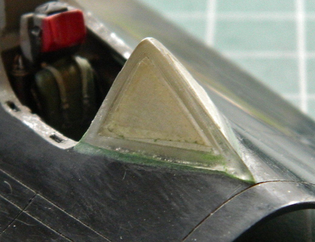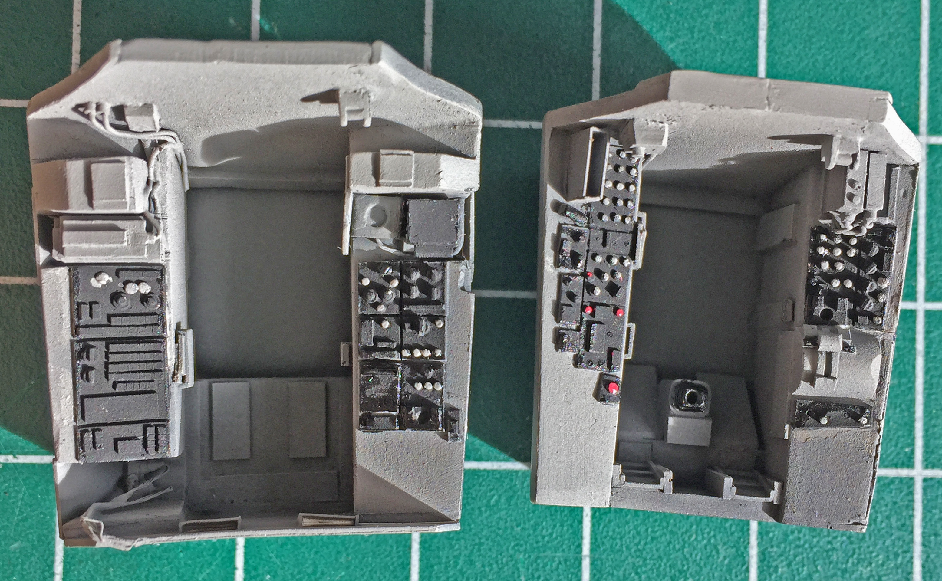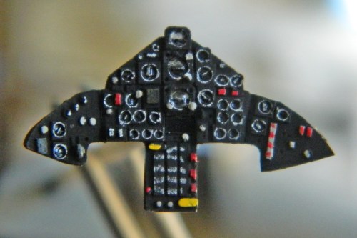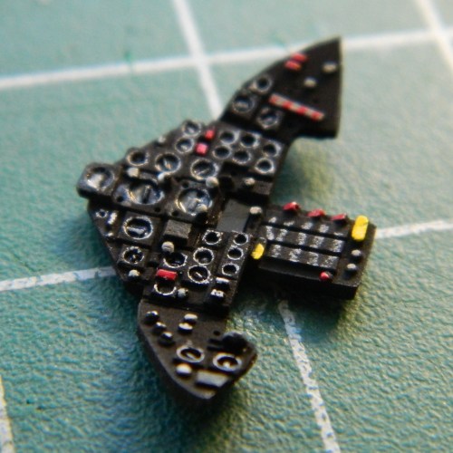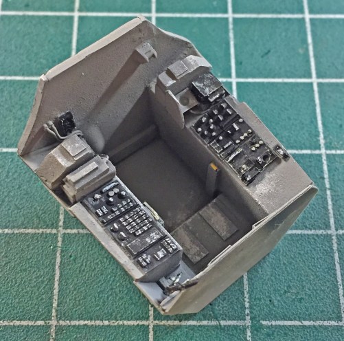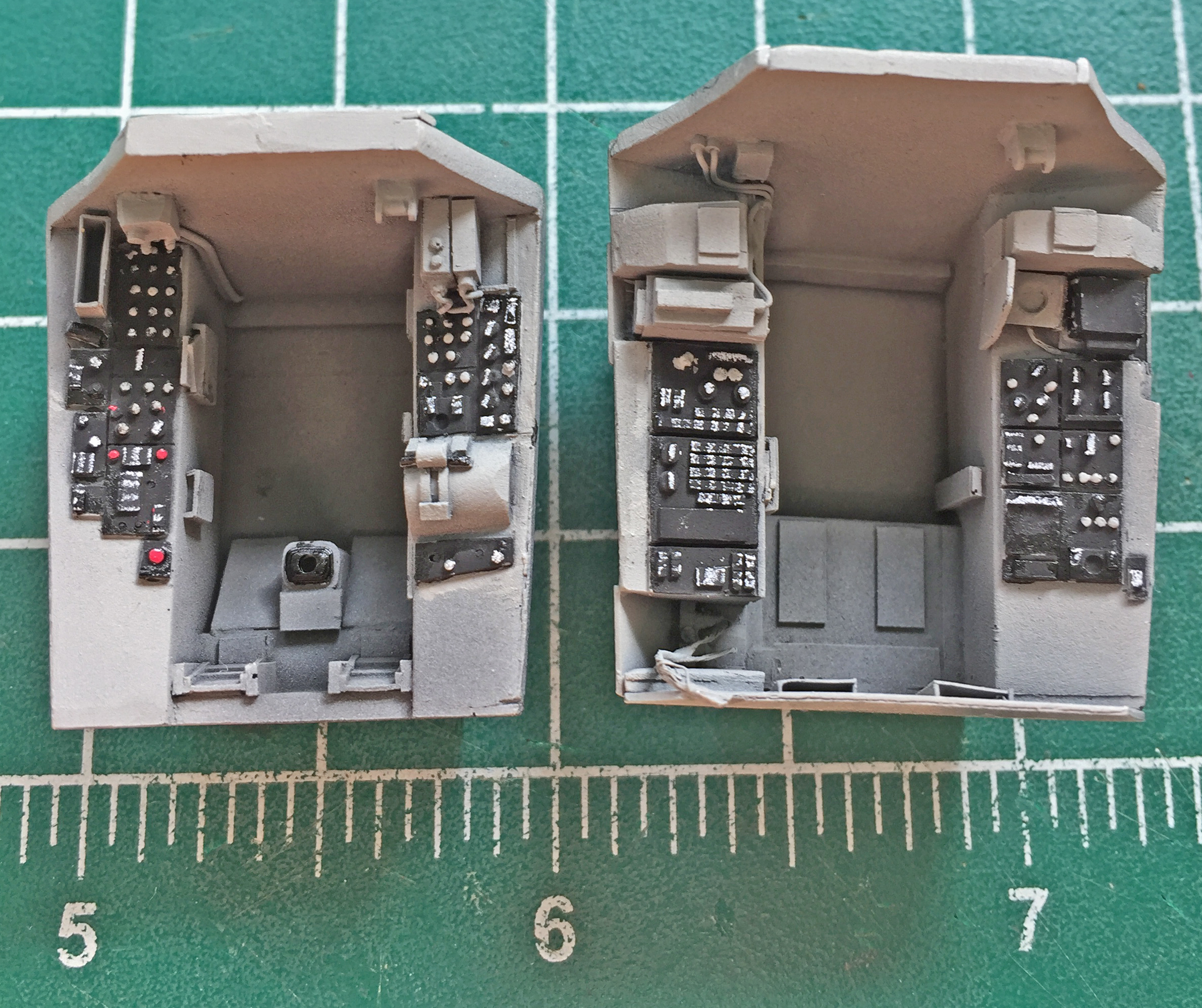 With the basics done, it was time to do the really fine stuff. For the pilot’s panel that meant I put a drop of clear gloss on each instrument. For the RSO’s panel, I glued the film I used for the CRT screens into place using diluted white glue (the pilot’s panel also has a small CRT screen under the three center gauges but it’s almost impossible to see) (almost):