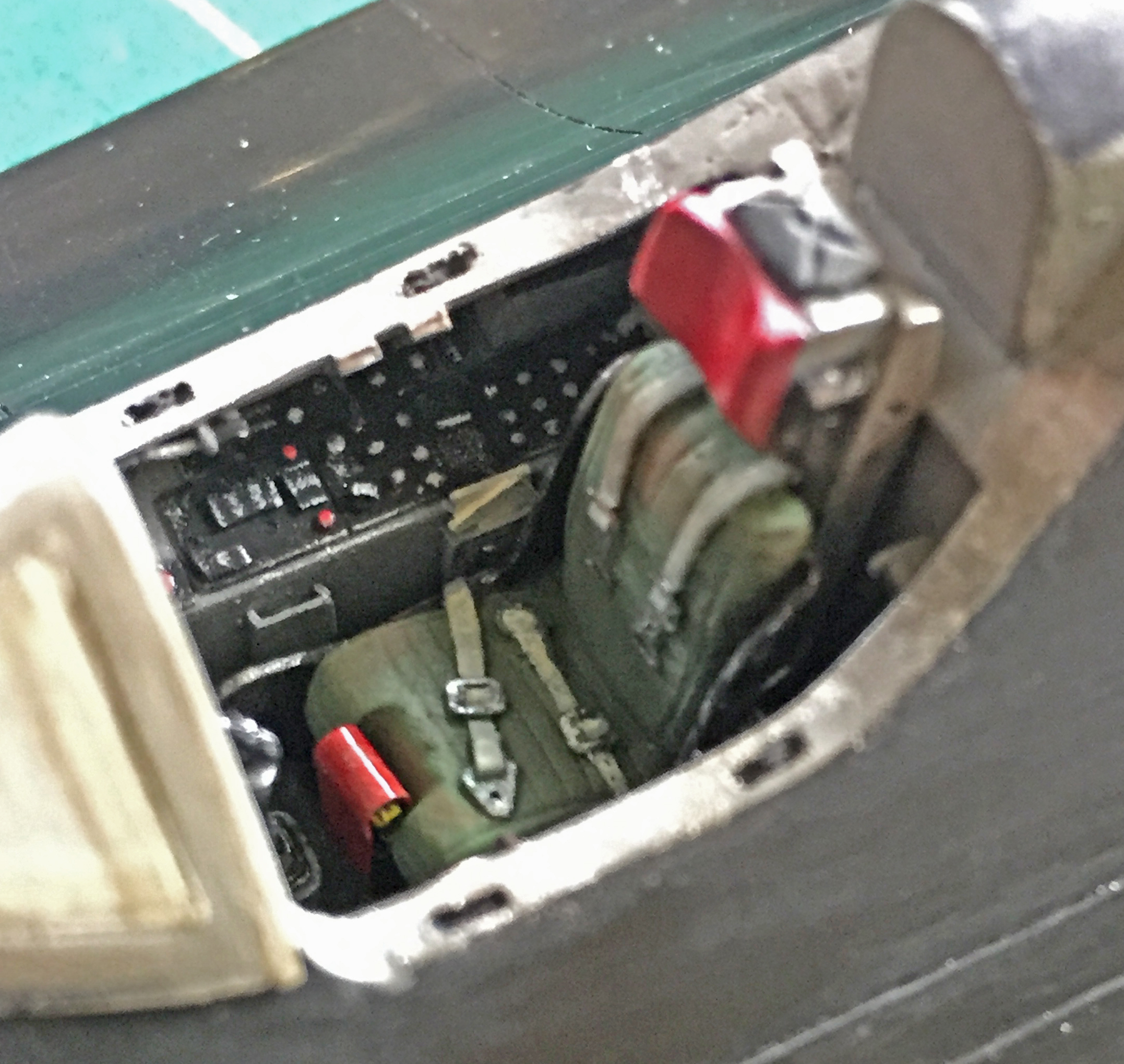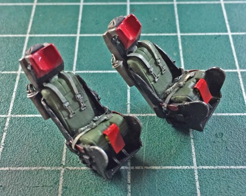 The ejection seats get several different colors added (the green was misted over the flat black in the same manner the gray was done on the tubs). Red was used on headrests and ejection seat trigger covers, and aged white was used on the harnesses (as well as the “papers” in the in the trays in the cockpit tubs). Once that was done I used flat aluminum paint on the harness latches and to add chips and wear marks: