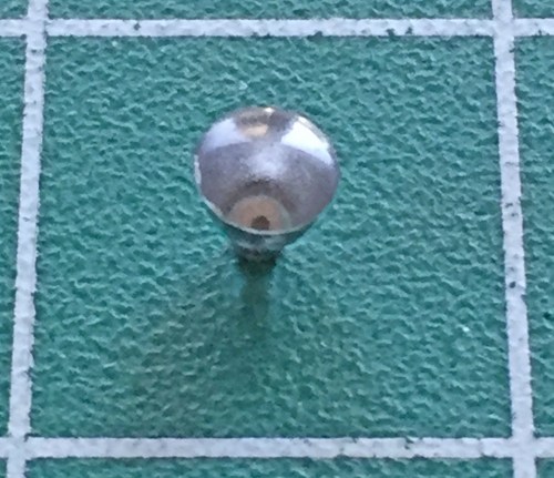 I do NOT like trying to replicate a clear item with opaque paints. (That’s sort of like getting drunk every night to promote sobriety.) There are two very prominent landing lights attached to the strut of the nose gear and the only parts on hand are opaque. Gah. I chucked a piece of clear acrylic rod into my lathe and turned a section down to the diameter and shape I wanted. Then I used progressively finer grit sandpaper to remove the steps left by the cutter and then polished out all the marks left by sanding paper. Once satisfied, I cut the work from the acrylic rod, which left a small stub on the end. Instead of cutting that off, I decided to use that to drill a SMALL hole (.0135″ [.343mm]) to replicate the bulb. I dipped the tip of a needle into black paint and stuck it in there, then used Molotow’s “Chrome” pen to create the reflector. So far I’m very pleased with the results (only time will show me how the “Chrome” accepts the black paint it has to have on the exterior):