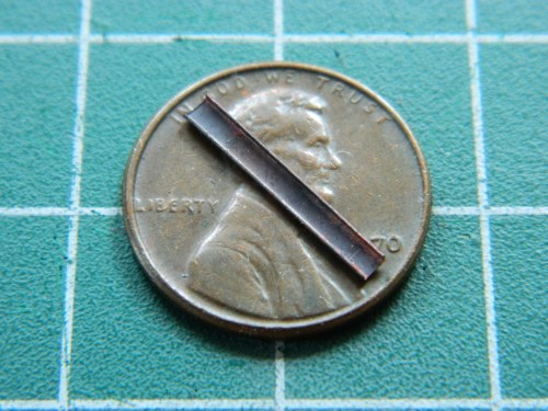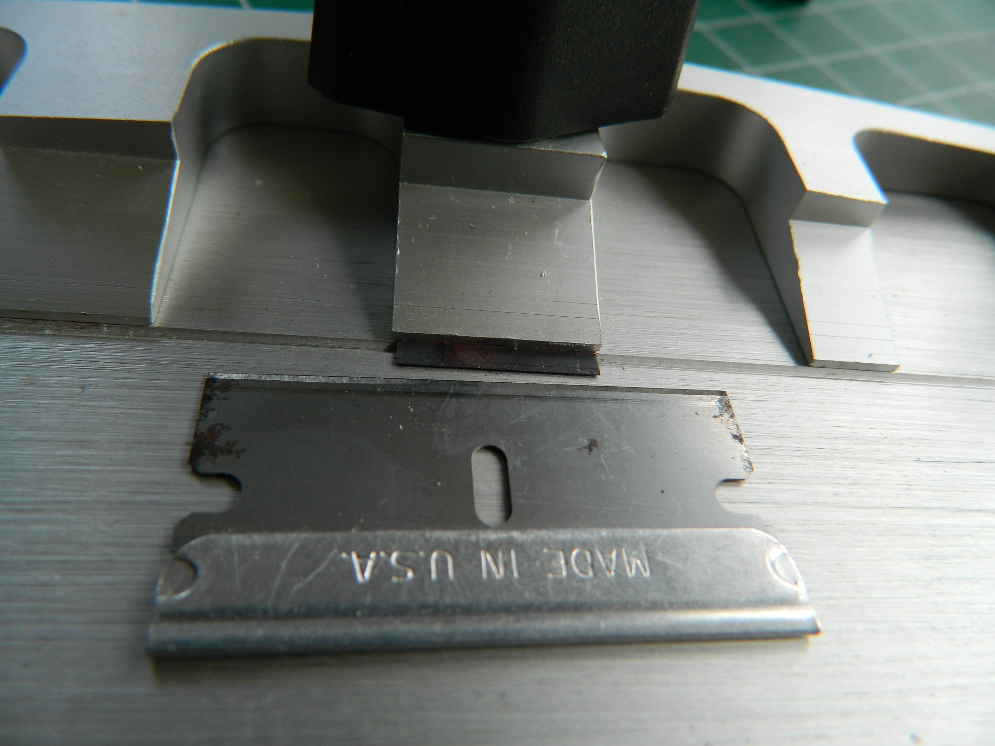 Sometimes instead of plastic sheet, I’ll make details from copper shim stock (.005″ (.127mm) and .010″ (.254mm) because that’s what I have on hand). There is a small “C” channel and rather than try styrene, I used .005 shim stock. To get tight bends, I’ve found that if I anneal the copper prior to bending, I can get much tighter and sharper bends. Once the copper cooled, I took out my PE bending brake. I used a needle to score my bend line (not because it actually scores it but because I need an alignment line to follow), fiddled with the copper until I had it correctly lined up, and then used the razor blade to make my ninety degree bend by slipping the edge of the blade under the copper that sticks out and lifting it up: