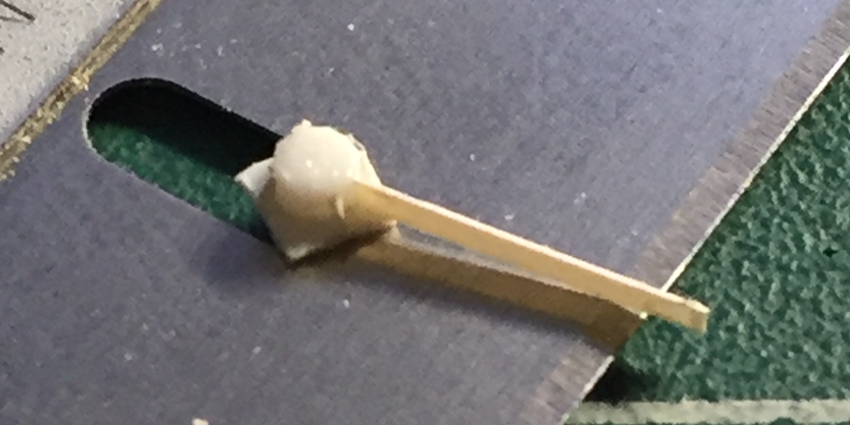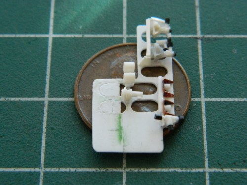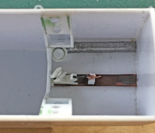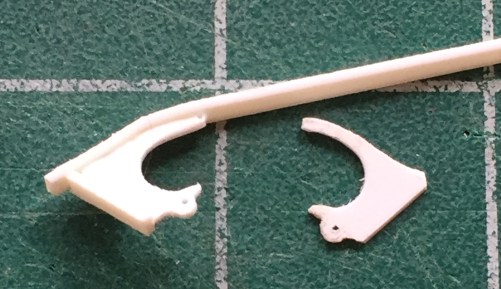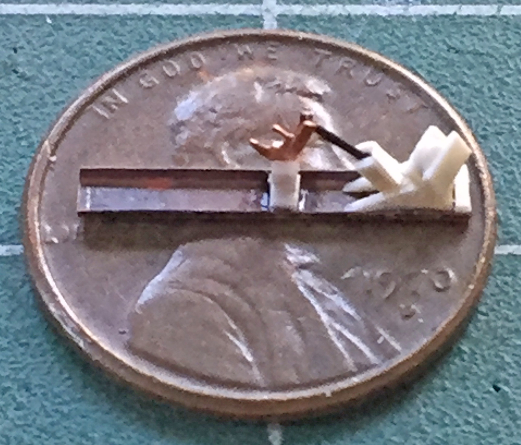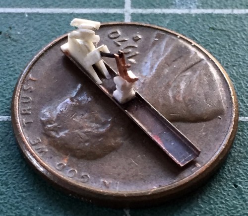 The “C” catch and its arms were also done with .005″ (.127mm) copper, its mounting done with little bits of scrap styrene, the pulley mount fleshed out, the connecting arm done with stretched sprue, the pulley added, and all of that added to the “C” channel: