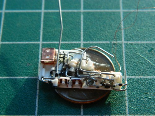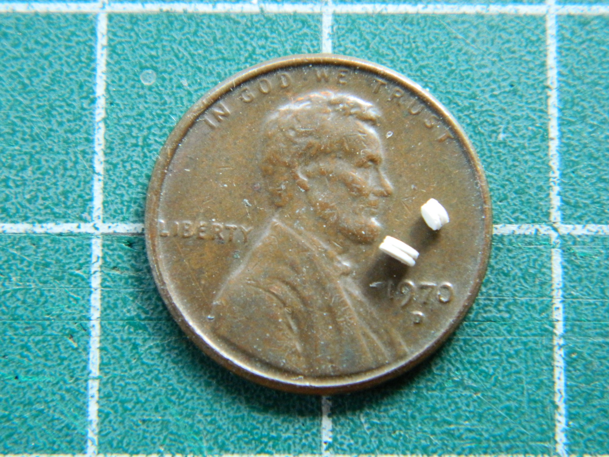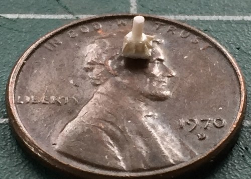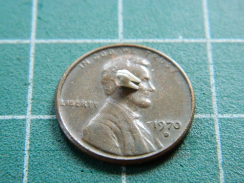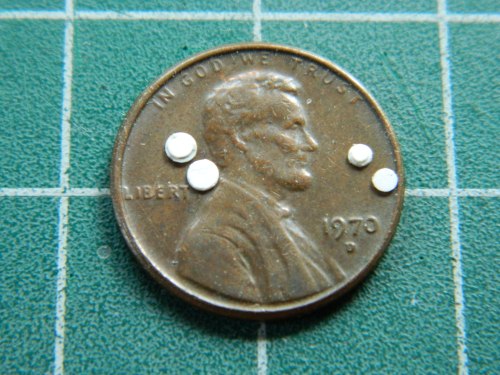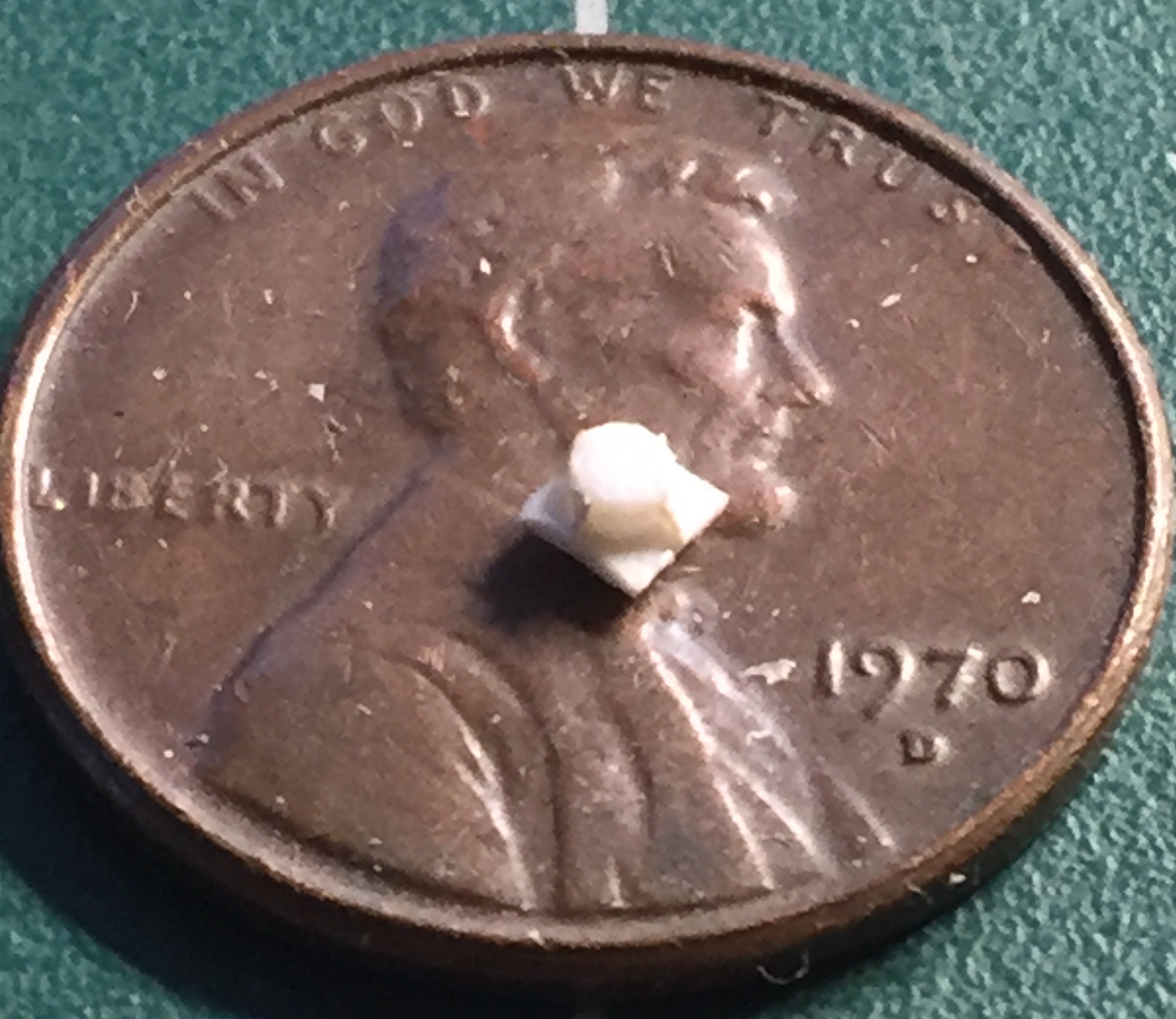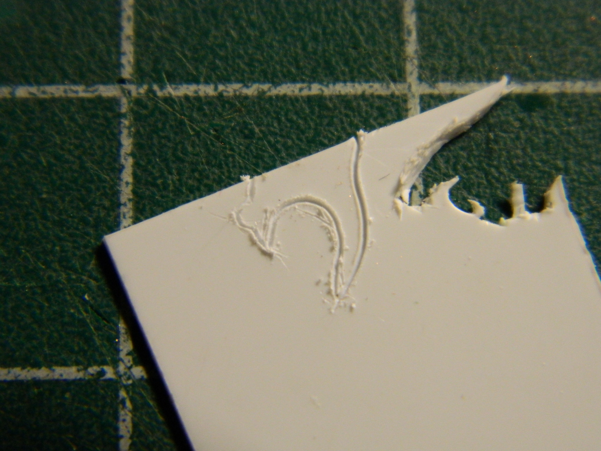 Right after the above photo was taken, I picked the copper template up with my tweezers and PING…it vanished, never to be found again (of course, my cat will find it, eat it, and maybe I’ll see it again after the vet digs it out of whatever part of her alimentary canal it decides to puncture). So I made another one. Again, I traced around it with a needle until I worked through the .015″ (.381mm) styrene: