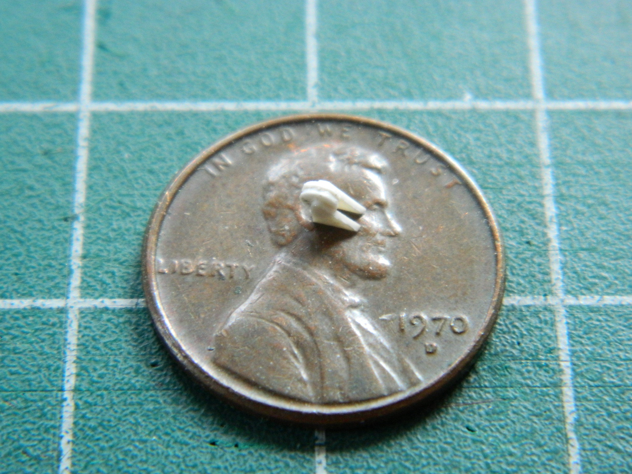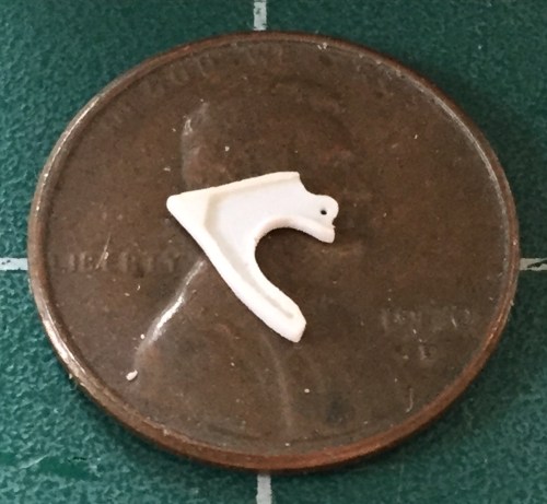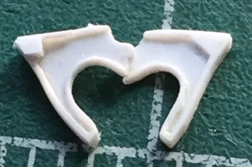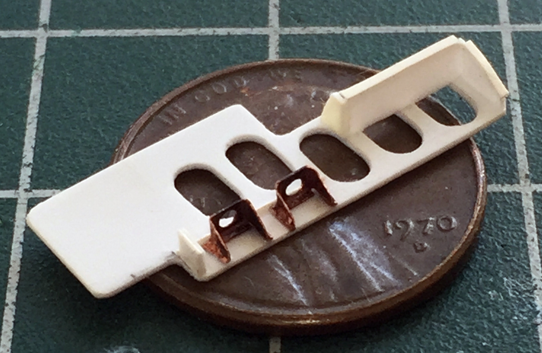 Due to their shape and small size, rather than use styrene to make these mounts, I went with .005″ (.127mm) shim stock, annealed and bent as earlier, with holes punched out: