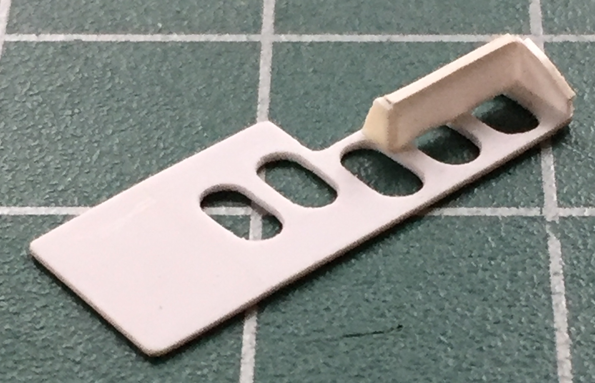 Next was to start making the various parts that live on that panel. I started with a mounting bracket for what appear to be pressure regulators. I used .015″ (.381mm) styrene for the mounting bracket and .005″ (.127mm) styrene for the pronounced lip: