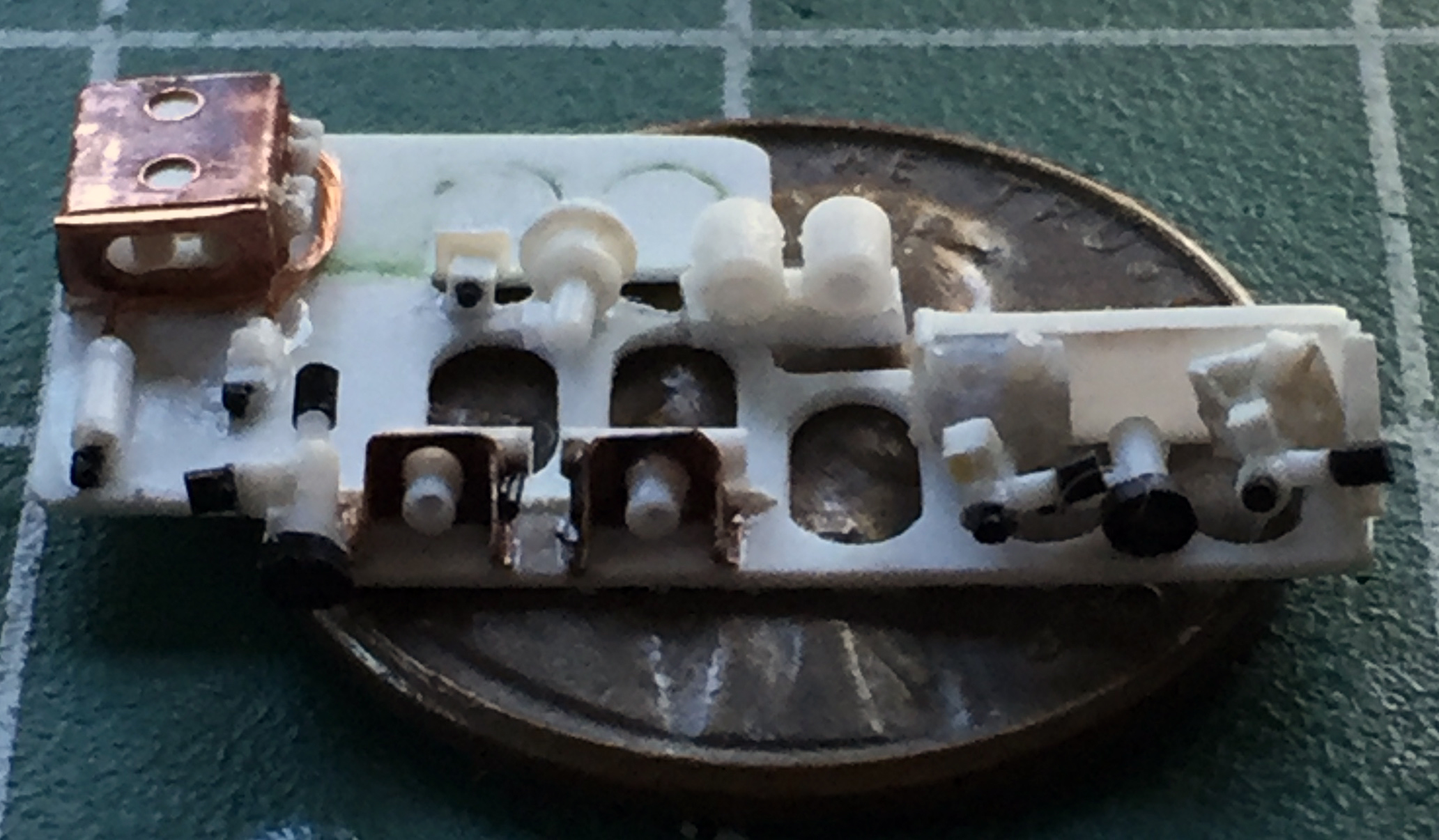 I added the copper colored box on the upper left of the plate (body is .005″ [.127mm] copper and the face with the oval cutout is .010″ [.254mm]), added wiring (eight strands of 48awg copper wire), wiring connector, and plumbing connections: