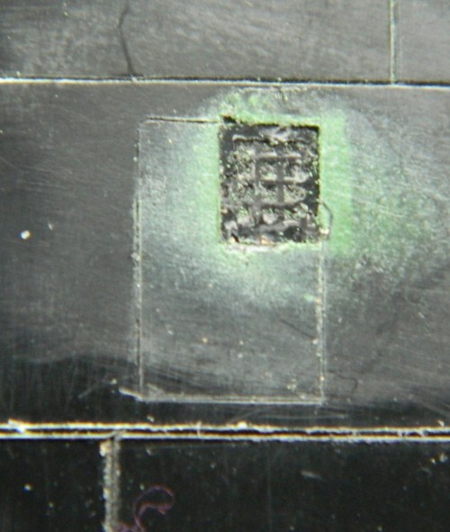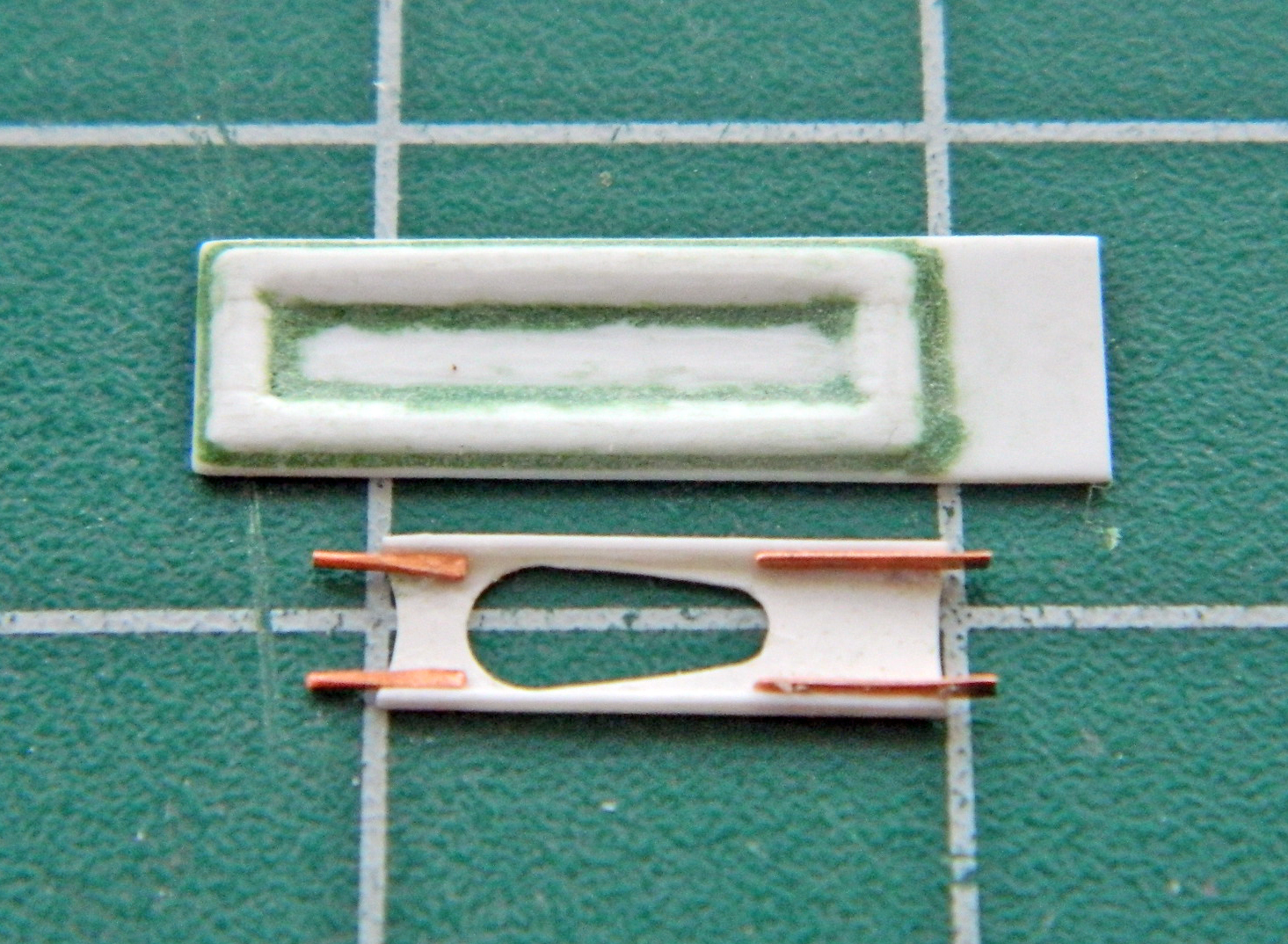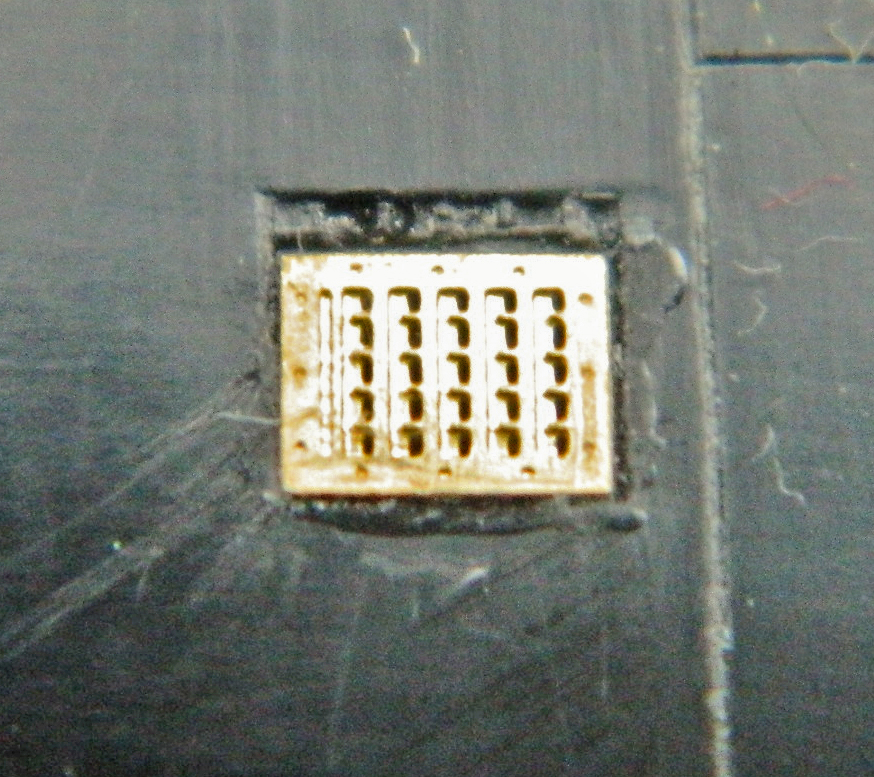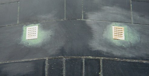 Satisfied that maybe now I was on the right path, I repeated the scrape, glue, and putty cycle with the correct grates in the (relatively, I hope) correct location (after one false start, evidenced by the lines at the left of the left grate below):