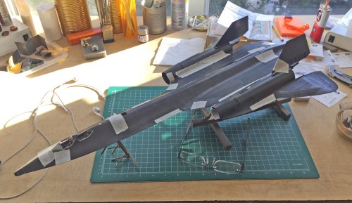 Things occur to me when they do. With this blog, I can present things as if these things occur in a linear manner…but they don’t. The most recent example of this occurred the next morning, propped up in front of the bench, and when the coffee finally wet my neurotransmitters sufficiently for them to propagate a spark, I wondered, “Do I need to add nose weight for this thing to sit properly on its landing gear?” Rather than do useful work so soon after that initial daily spark, I taped all the major components together to see what the weight distribution looked like. I placed the supports directly under where the landing gear parts are going to mount: